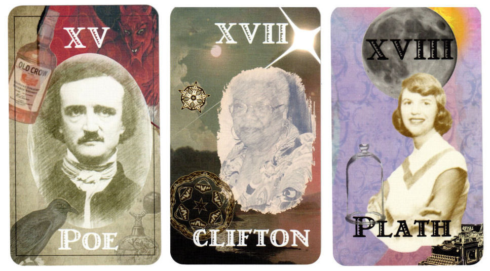 The Majors consist of 22 American and British poets writing in the English language. While the 22 keys of the Major Arcana in the Poet Tarot are certainly inspired by the 22 keys in the traditional tarot deck, the Poet Tarot’s Majors do take on a life of their own and have become their own unique divination system. In the above 3 Majors shown, you’ll see imagery in the background of the cards that reference the tarot correspondence. In Key XV: Poe, for instance, you’ll see a contemporary rendition of the devil (red with horns) for The Devil; in Key XVII: Clifton, you’ll see imagery that calls to mind stars for The Star. Sylvia Plath would have been my choice for The Moon, too.