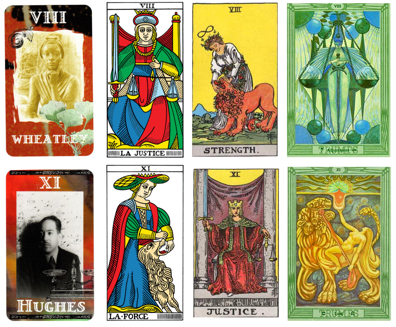 One of the key differences between the three main tarot systems can be found in the assignments for Key VIII and Key XI. In the Marseille and the first Golden Dawn tradition of tarot divination, Key VIII is Justice and Key XI is Force, or Strength. Waite switched the order in his system for theosophical reasons to align the Majors better to the theosophy of the Golden Dawn (I believe, based on what I’ve read). Key VIII in the Waite became Strength and XI became Justice. I’ve also included for comparison the Thoth. It’s the scales pictured in Key XI: Hughes and Langston Hughes’ association with social justice that convinces me that the Poets section is influenced directly by the Waite system, not Marseille or Thoth.