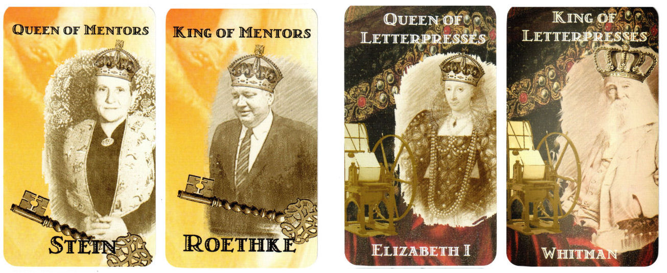 The cards are subdivided into the Poets (Major Arcana) and the Suits. The Suits are Quills, Muses, Mentors, and Letterpresses, corresponding with Wands, Cups, Swords, and Pentacles respectively. The four suits represent the four stages of the creative writing process: Quills for creation, Muses for inspiration, Mentors for revision, and Letterpresses for completion. I really love the thoughtful way Agodon and Spaulding-Convy have designed the Poet Tarot deck.