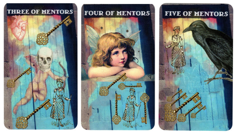 The suit of Mentors is perhaps my favorite suit of the Minors. Mentors in the creative writing process represent revision, and so the Mentors, symbolized by keys in the Poet Tarot, correspond with the suit of Swords. The imagery for this suit is stunning and for me, are inspirational. Something about this suit helps me to tap into the unconscious and for me, work the best for one of the guidebook’s instructional reading techniques–to draw cards as you write or create art and go on the rule that you must allow the imagery of the card drawn to inspire something in your work. Whether it’s just my personal aesthetic biases or whether the creators actually put more time and thought into the suit of Mentors, I found the suit to be the most helpful as an oracle deck. When divining for creative projects, I might just separate out the Poets and the Mentors and use that as a mini oracle deck to draw from for insight.