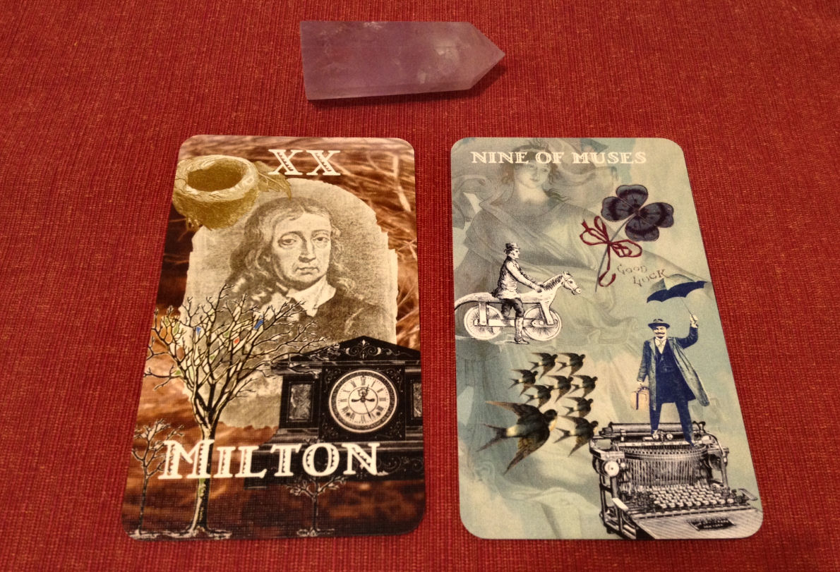 So then I went into the guidebook to see what the associations are for Milton and the Nine of Muses. In Milton, when that card is drawn, the guidebook says I should reflect on and evaluate my creative life. It is the card of self examination and figuring out what parts of my creative work need an overhaul. It’s about understanding my own creative work in the context of the larger creative community. I like that. I like how the creators of the deck have reinterpreted Judgement, synthesizing it with our understanding of Milton’s biography and oeuvre. The Nine of Muses is about celebrating the harmony of creativity and output.