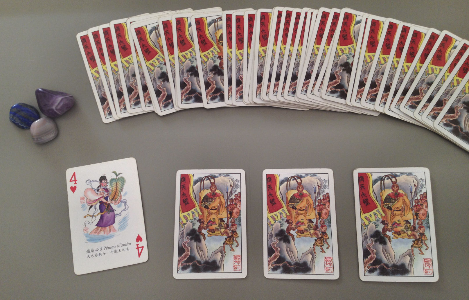 I’d bet the creators of the playing deck weren’t thinking too hard about which characters to print on which cards. It’s supposed to be for games, I’m sure, not cartomancy or divination. So the personalities of the characters don’t really match up to our textbook understanding of the suits and numbers per traditional cartomancy. (See here for a complete list of all characters in Journey to the West to get a sense of the other cards in the deck.)