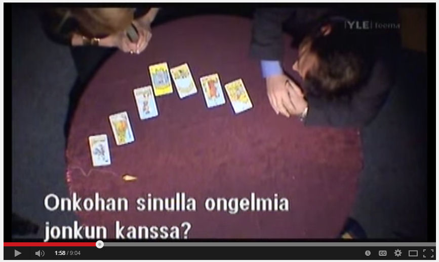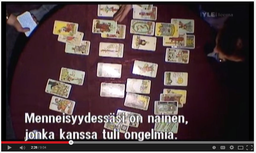 I came across this video clip on the interwebs. It seems to be from one of those rational skeptic shows, one called “The Bulls**t Detective” (Series 1, Episode 4), meant to debunk “pseudoscience and . . . new age nonsense.” By the accent of the show’s host, Alasdair Jeffery, I’m assuming it hails from the UK. Not so sure of the language of the subtitles. If you’re a tarot reader, I strongly recommend that you watch this and, I hope, read my assessment of it below.