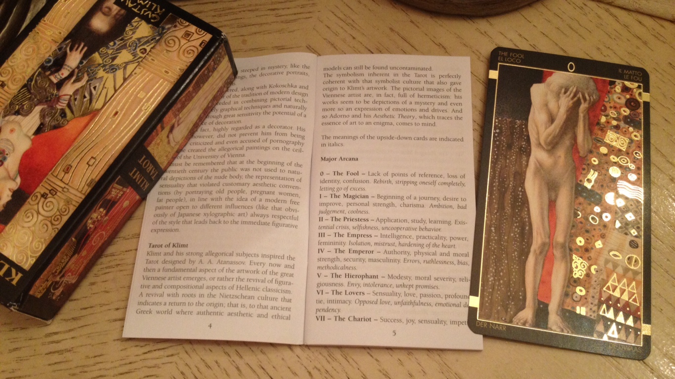 On the side of the box pictured above, the top image is from one of my favorite paintings by Klimt, “Medicine (Hygieia),” which so perfectly appears on The Magician card in the deck. While more and more decks are moving to China for printing and manufacturing, these decks are still made in Italy. The box and packaging is finished beautifully and is part of what renders this deck such a rewarding collector’s item. It was first published in 2005 and the brainchild of the Bulgarian-born Atanas Antchev Atanassov.