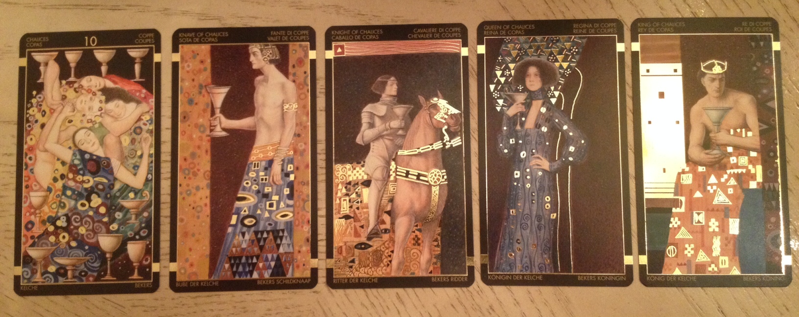 The Ten of Cups features “Junge Frau” with the addition of chalices. The Queen of Chalices appears to be a digital alteration of “Emilie Floge 1902” with her right hand modified to hold up the chalice, though the face on “Emilie Floge” compared to the face on the Queen of Chalices seem to differ, so I’m not sure. Perhaps it’s from another one of Klimt’s works that happens to be strikingly similar to “Emilie Flogie.” In the above photograph of the King of Chalices, what looks like a big white vertical rectangle is just the glare from my house lights. What’s there is a beautiful gold pillar.