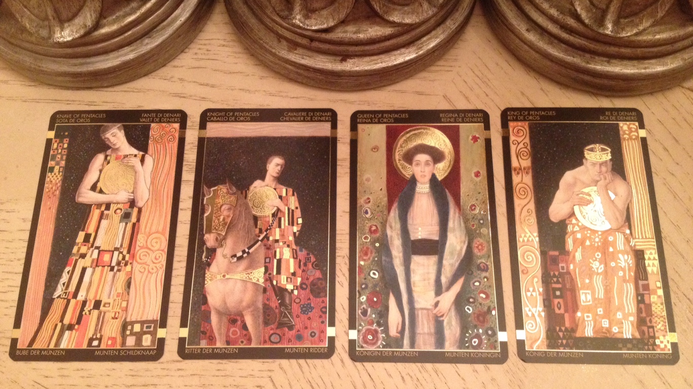 One year in high school I had a spiral bound day planner I bought at a museum gift shop that featured Klimt’s artwork. I carried Klimt around with me everywhere that year and afterward, cut out the full-color prints that appeared in the day planner, framed and placed them around my room. An art poster print of “The Kiss” was hung up in my bedroom through my adolescence and young adulthood. Currently in the halls of my day job office hangs a really nice framed print of “Adele Bloch-Bauer I.” [Also, tell me it isn’t just me– is there or isn’t there something very Nine of Pentacles about that painting.]