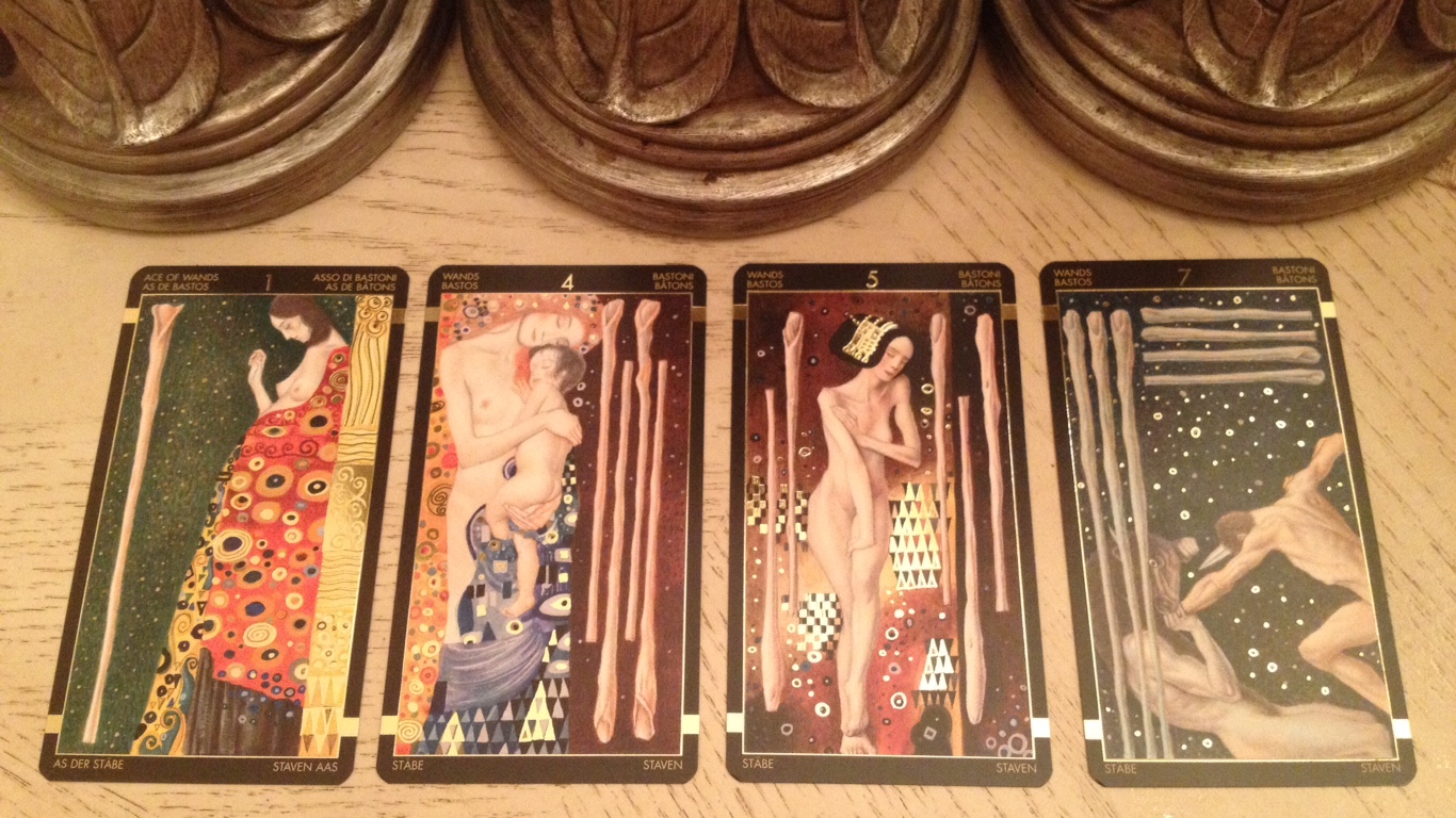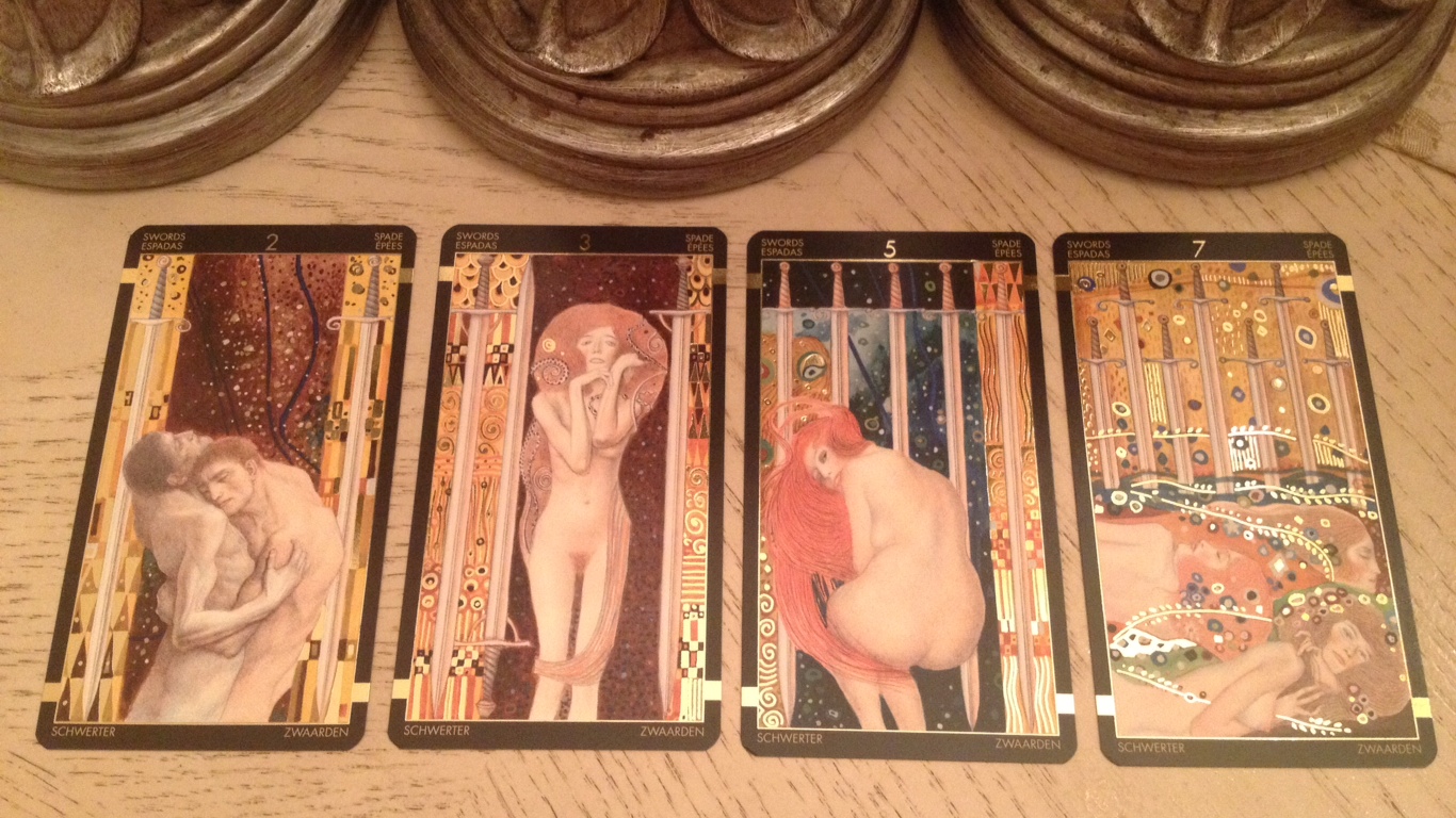 The final “part 3” and last four cards in the circle represent the seeker’s emotional situation. While the cards as they are aren’t difficult to read as an RWS reader, the Klimt Tarot might not be my deck of choice for a workhorse reading deck in professional practice. It’s definitely more of a collector’s item, but boy, as a collector’s item, deck collectors are going to want this deck. Any enthusiast of the Art Nouveau movement is going to appreciate what Atanassov and Lo Scarabeo/Llewellyn have done here.