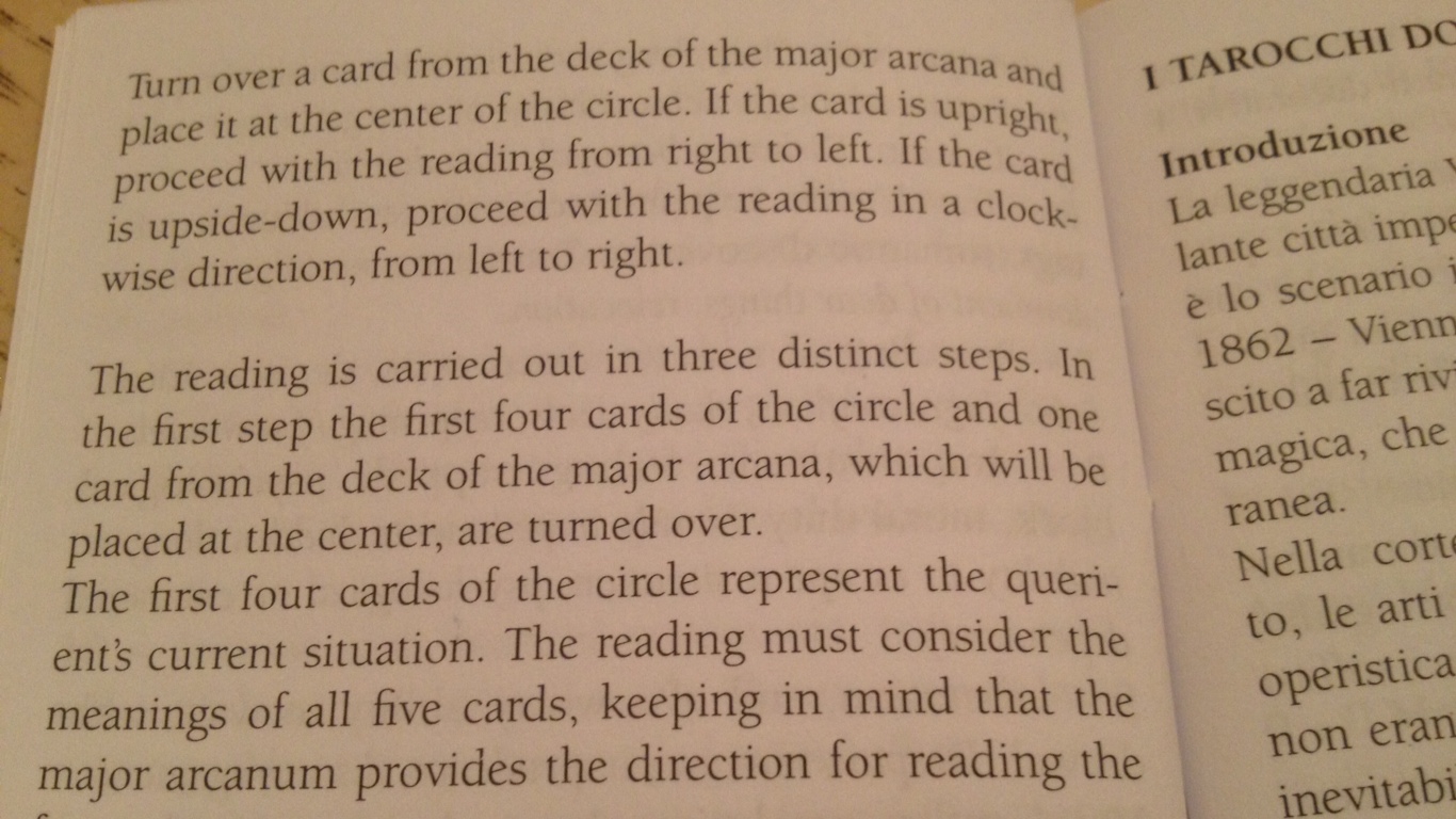 The instructions say that if the Major Arcanum is turned over upright, then you read the circle of cards from right to left, which would be counter-clockwise. If the Major Arcanum is reversed, then read left to right, or clockwise. Then you read the spread in three steps. Since The Empress in my reading appeared in reverse, I was supposed to go clockwise, but I bungled it up and mistakenly went counter-clockwise, so bear with me here. (Also, it’s probably because in my mind and per my practice perspective and general metaphysical approach, upright and right is always associated with clockwise, while reversed, upside-down, and left is always associated with counter-clockwise, so my brain immediately went to “counter-clockwise” when I saw the reversal and as a result, forgot how to read directions.)