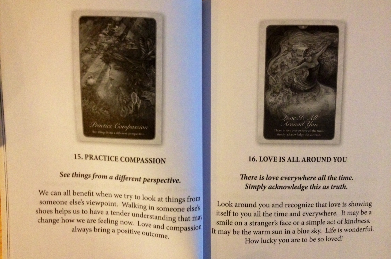In comparison to, say, Alana Fairchild, another big name player in the feel-good oracle cards industry, the Whispers of Love Guidebook is sparse. See above sampling of two card entries, Card 15 and 16 respectively. In fact, I would say you probably don’t even need to read it, whereas with Fairchild’s decks, I would contend that you do need the Guidebook, like the Kuan Yin Oracle, which I’ve reviewed before, or the Sacred Rebels and Journey of Love, two other decks I have that I’ll review at some future point. Fairchild (or her publisher?) devotes a great deal of diligence to writing out the corresponding card meanings and messages for her decks, whereas here, I would say everything you need to know about any one of the cards in Whispers of Love is already on the actual card itself.