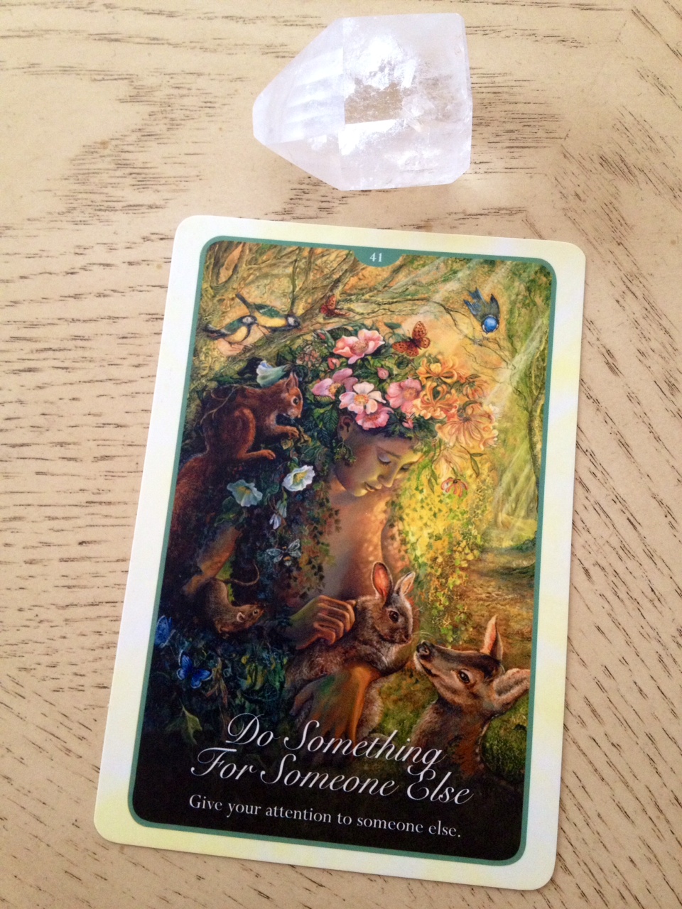 There’s also a naturalistic energy to the cards, again with the seamless juxtaposition of earthly-nature and the cosmic worlds beyond (such as in the preceding Card 40). You may also note all the animals featured are gentle, or associated with gentleness, and that truly is the strongest energy emerging from the Whispers of Love oracle cards–gentleness.