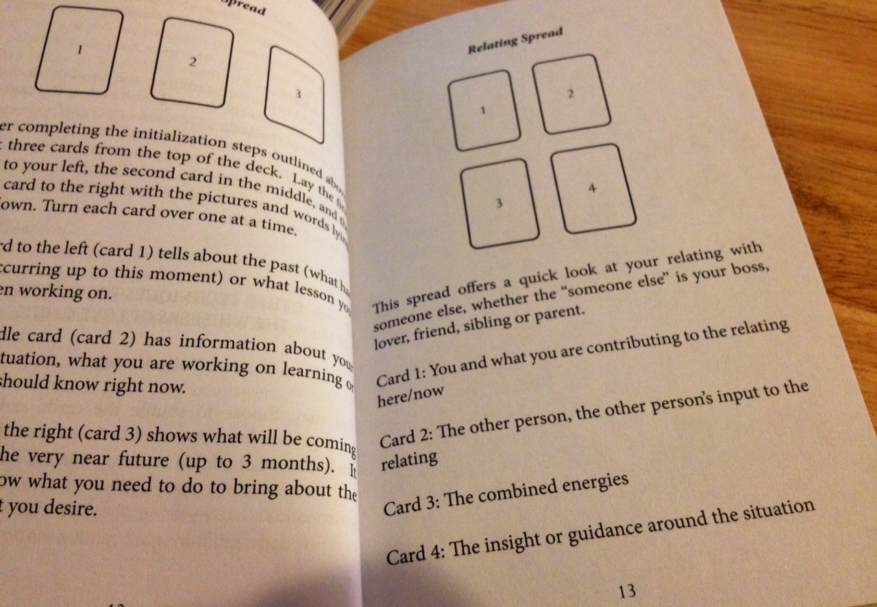 The Guidebook is useful for its content on oracle cards divination and instruction on a few great card spreads. Since the purpose of this deck is for helping us gain spiritual or divine insights into our interpersonal relations, it made sense for me to try out the Relating Spread, pictured above.