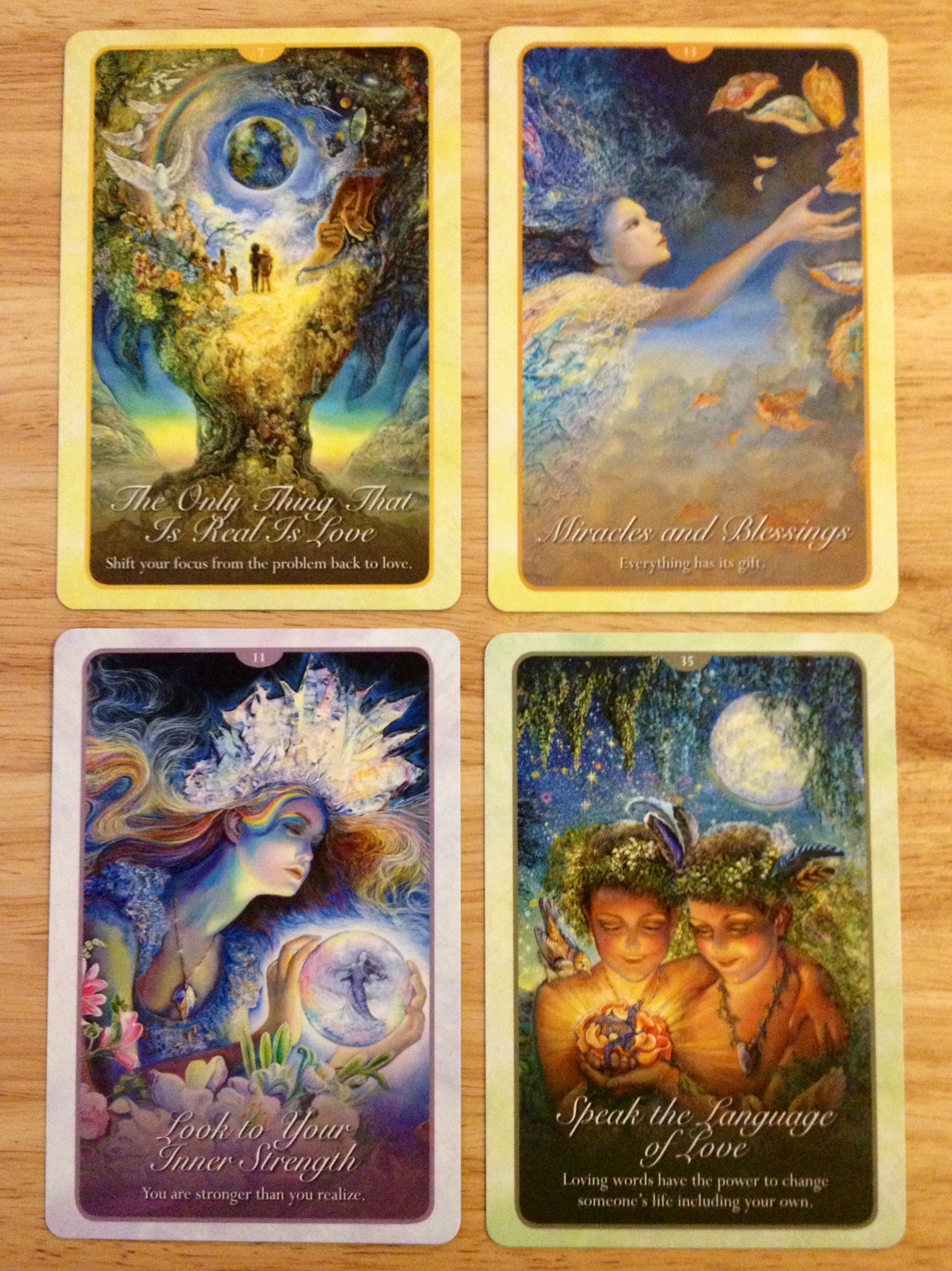 What makes the Whispers of Love deck by Hartfield stand apart from Virtue oracle decks is the cohesiveness of the artwork. I love, love, love that the publisher opted for a single artist, Josephine Wall, rather than compile a hodge podge of artists that often result in a disjointed vibe in the oracle decks that feature multiple artists. So I very much appreciate the publisher’s hand in preserving artistic cohesiveness in the Whispers of Love cards.