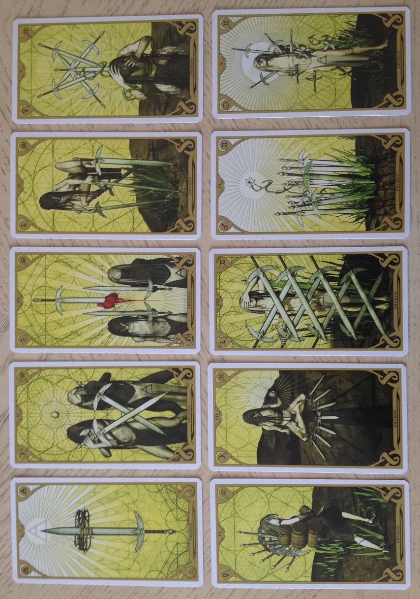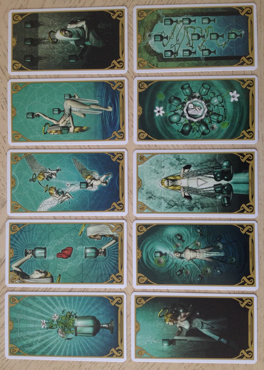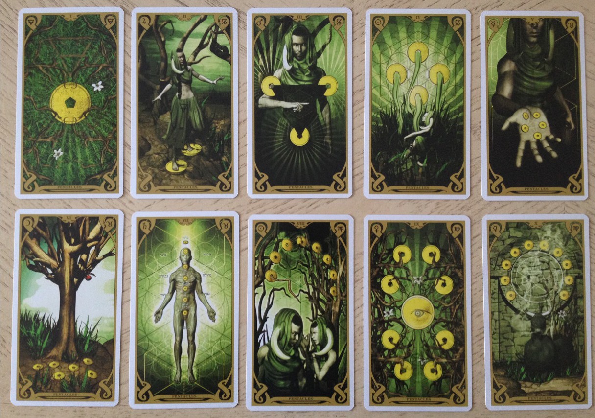 The suit of Pentacles reminds me of Chinese coins, though instead of the square cut-out in the center, you have a pentagon. On that note, there’s a lot of sacred geometry going on in the symbolism and imagery of this deck as well, which I didn’t get too much into in this review.
