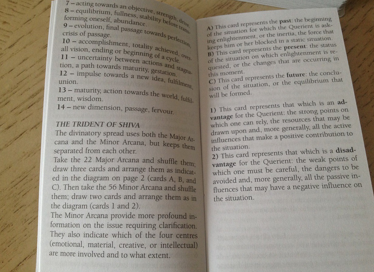 The spread, a diagram depicted in an earlier photo of the LWB, is the Trident of Shiva spread where the Majors and Minors are handled separately, a lot like the divination techniques espoused in well-known late 19th century esoteric tarot texts. Here, 3 cards are drawn from the Majors and 2 cards from the Minors. The Minors are drawn to develop the themes expressed by the Majors.