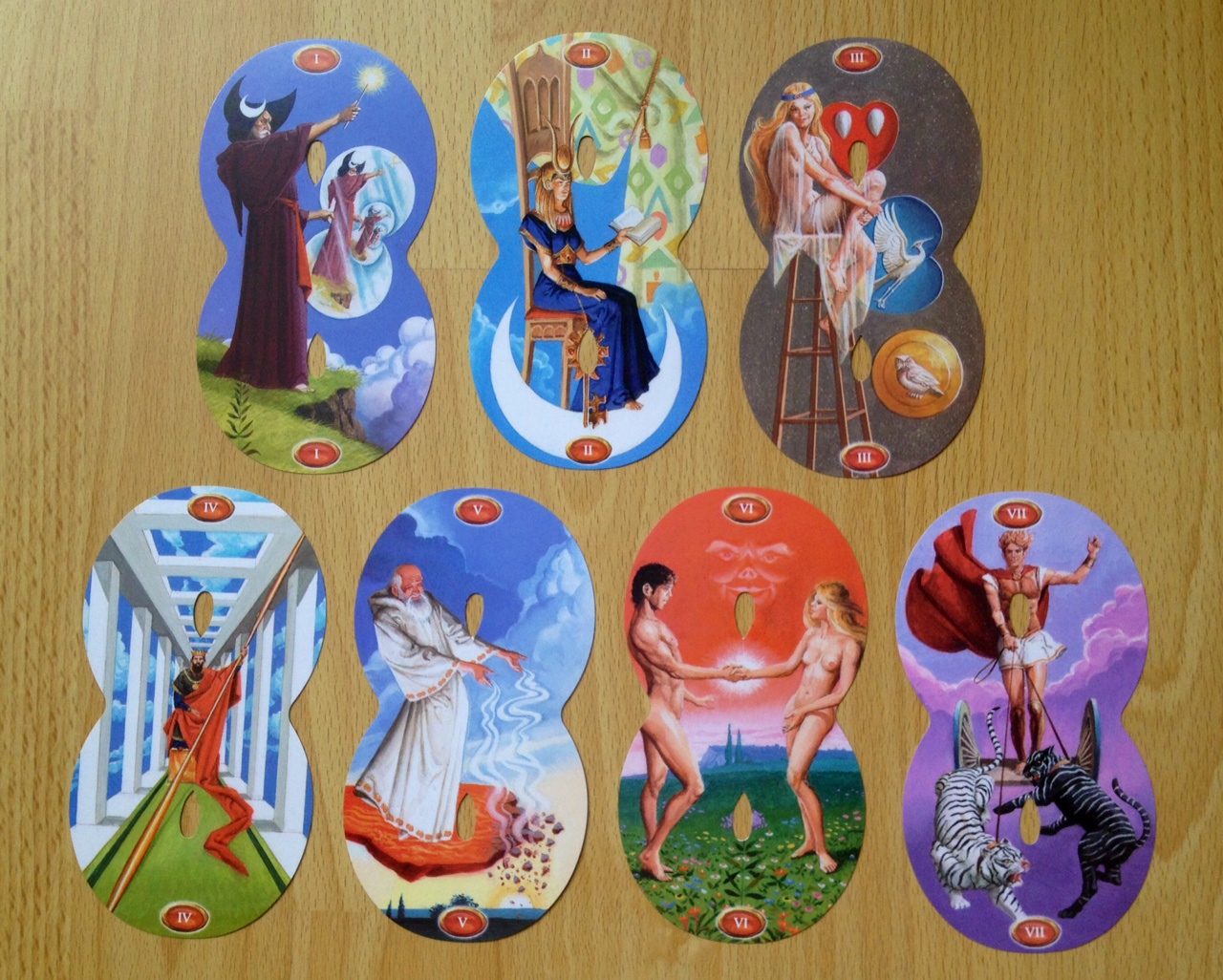 Sometimes the two cut-out holes for forming the lemniscate shape gets in the way of the art, like in the above-pictured Key XVII The Star or XXI The World, or how in the earlier Key VIII Justice and Key XIV Temperance the hole becomes the figures’ armpits. Doh, it’s the Hermit’s armpit, too.