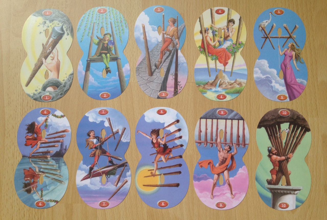 The illustrations have enough elements of iconic tarot decks to keep this deck easy to read and it also brings a lot of new interpretation to the table and to tarot consciousness, which I appreciate. I love the change in perspective for the Two of Wands, where the figure is facing us instead of facing away. Same in the Three of Wands. From the Five of Wands on up, we’ve got really creative interpretations for the cards that evoke the fundamental meanings most of us are used to but add so much new symbolism.