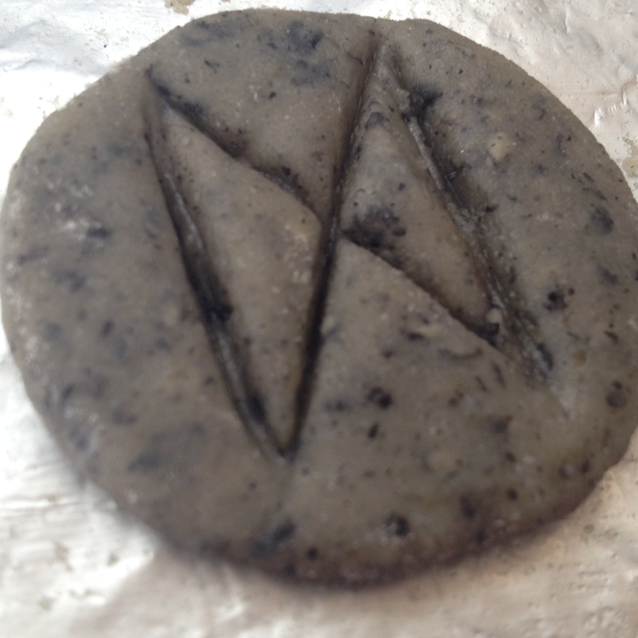 Here’s Dagaz, the last rune in the alphabet but the first rune I carved because my reference sheets I had printed out were out of order. Oops. Yet it’s apropos that this is the first rune cookie I carved out because it means breakthrough, epiphany, realization, and I feel like that’s exactly what happened when I decided to make runes out of black sesame shortbread.