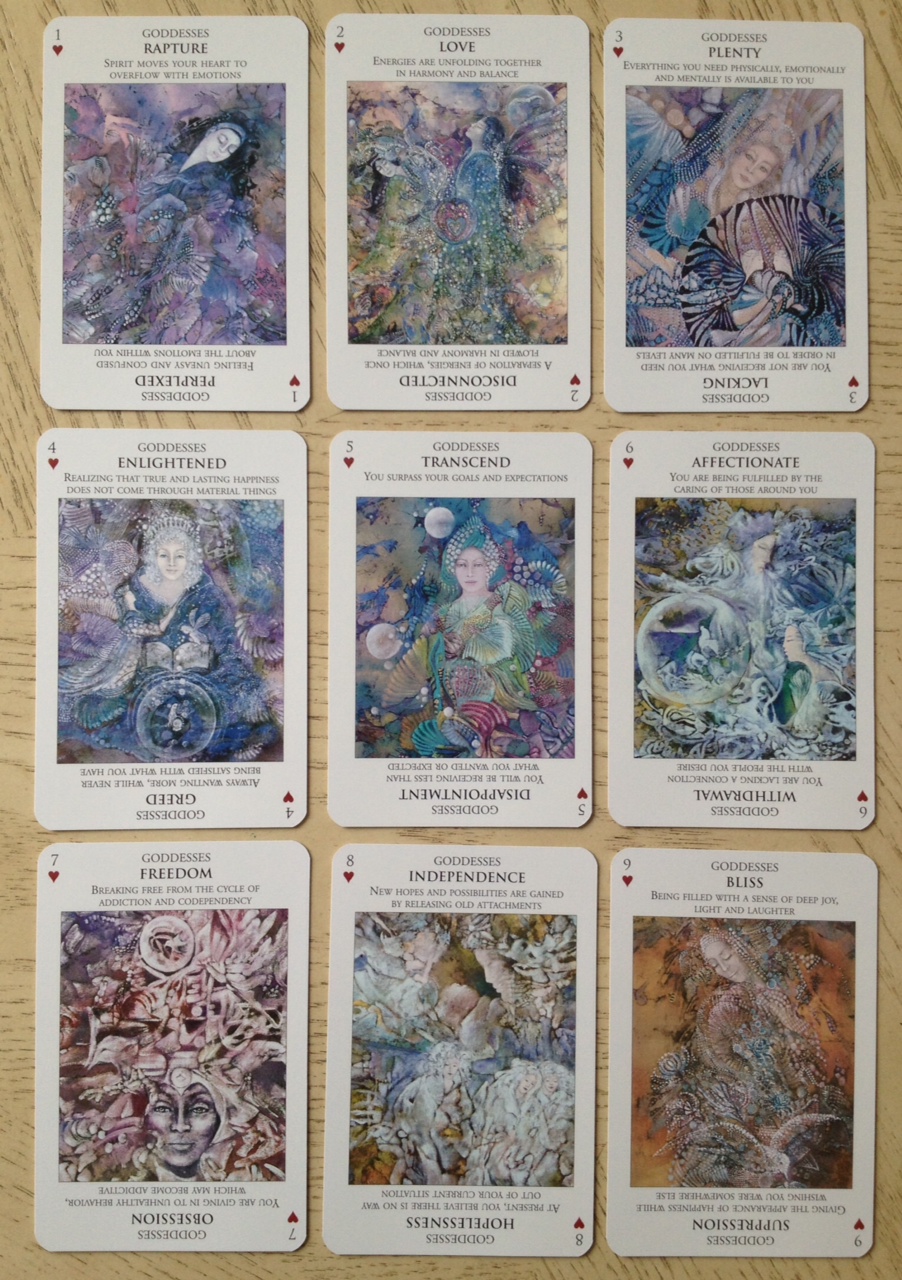The suit inscribed with red hearts corresponds with the tarot suit of Cups, but in the Guardians of Wisdom, is renamed to Goddesses.