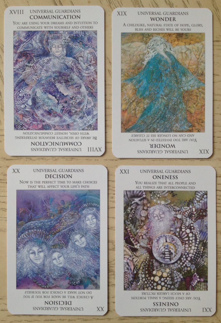 I find that I have different expectations for artwork when it comes to tarot and oracle decks. With tarot decks, I require the art to be rich with esoteric symbolism. With oracle decks, let’s be honest, I just need the art to be pretty. For me, if I’m judging the Guardians of Wisdom deck as a tarot deck, it doesn’t meet my expectations. However, as an oracle deck, it more than meets my expectations because Ledbetter’s artwork is breathtaking. They’re dreamy, there’s a beautiful Neptune quality to her style, and it really is what she says– it’s visionary art. Plus, it’s not like the art is too far a cry from the card meanings. The art for Key XXI, Oneness (The World card equivalent) is an apt visual for The World. Key XX, Decision (Judgement) works, too.