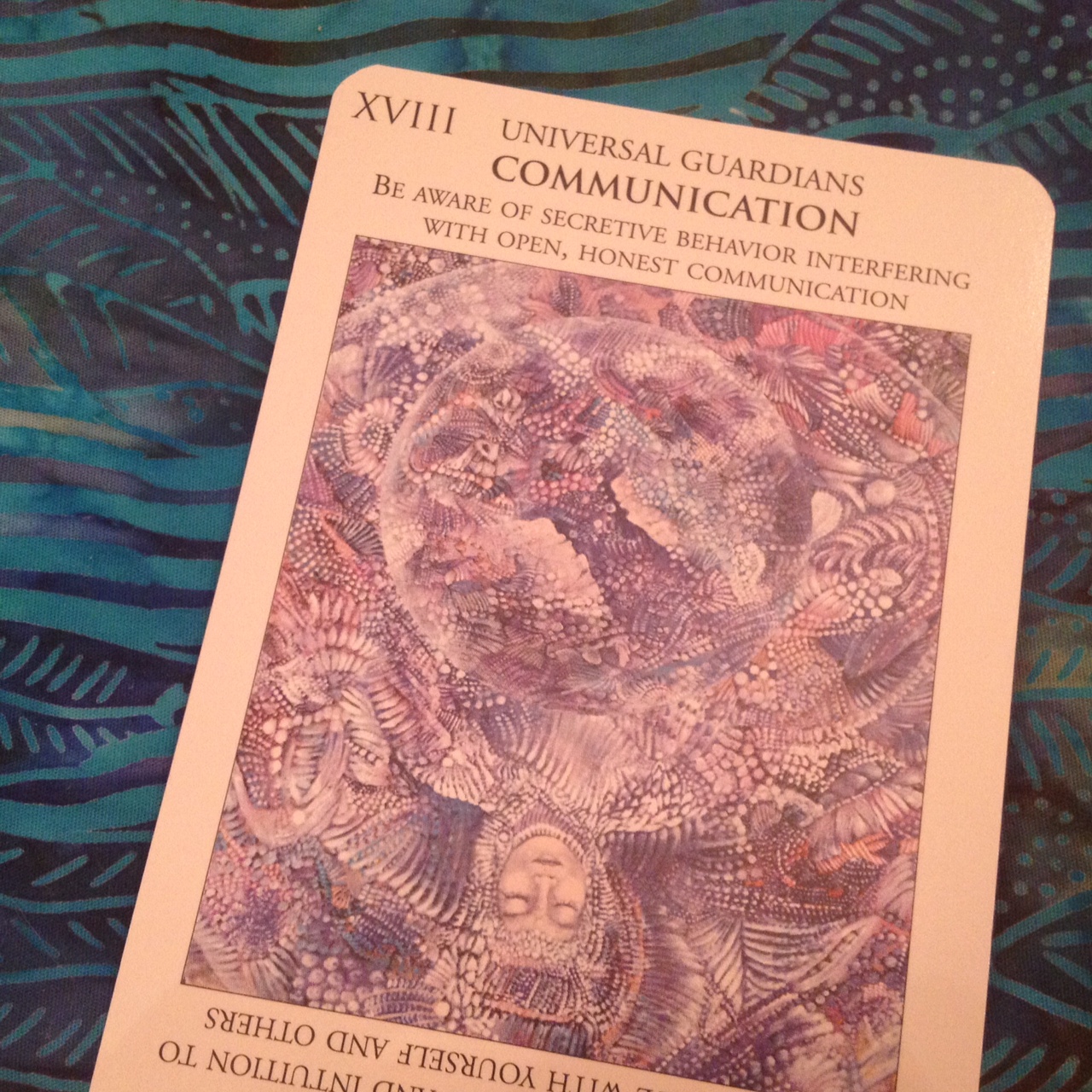 The above photo shows a card reversed. It’s not immediately noticeable that the card is reversed. Here is Key XVIII: Communication, reversed. Be aware of secretive behavior interfering with open, honest communication. It works pretty well with my understanding of The Moon card in tarot reversed. The artwork is also expressive of lunar energy.