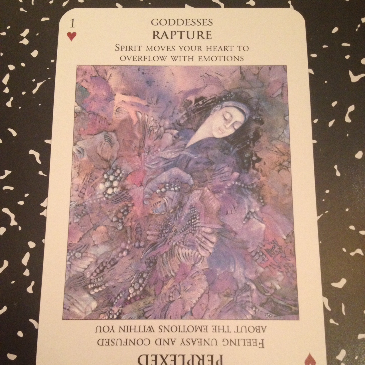 In the above photo, we see the 14 of Hearts, the Goddesses suit, or King of Cups reversed. Again, you are aware that the art is upside down, but the upside down imagery doesn’t actually bother you visually. It’s quite brilliant of Ledbetter, actually. I love how the art works visually both upright and reverse, without the imagery being technically reversible. You’ll also see the deck creator’s interpretation of the King of Cups, reversed: repression, and the holding back of one’s emotions.
