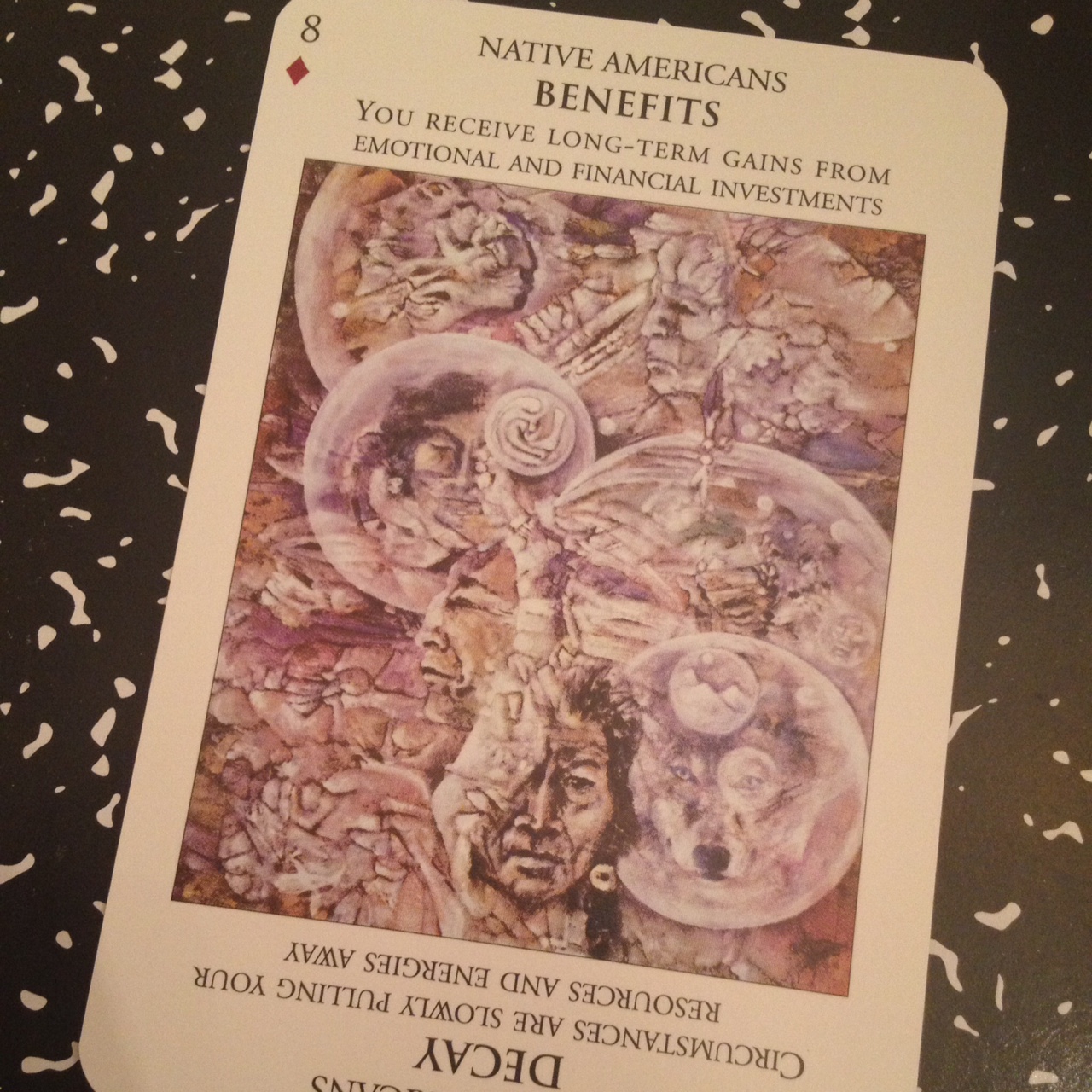 Here’s the Eight of Pentacles (or 8 of Diamonds) upright: Benefits. Receiving long-term gains on your investments. So this card meaning seems to deviate quite a bit from my personal reading of the Eight of Pentacles, but the same spirit, the same essence of the card is there, so I don’t mind it, and in fact, welcome it. As its own complete divinatory system, the Guardians of Wisdom deck really works. You just need to stop thinking about it as tarot. Even the deck itself is not marketed as a tarot deck. It’s marketed as universal power cards. And so I feel comfortable in categorizing it as an oracle deck that happens to be inspired by the classic tarot structure.