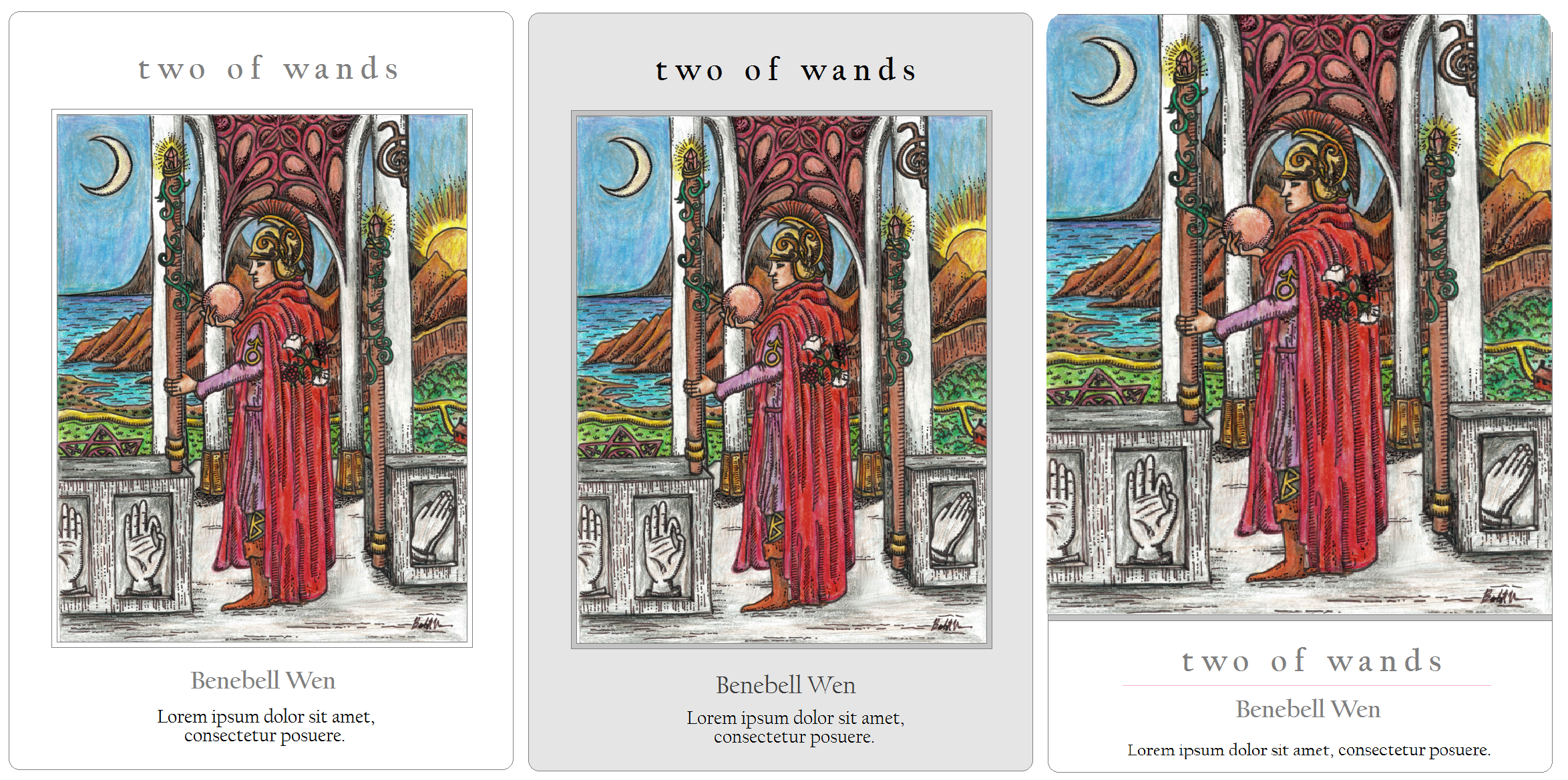 I’m not a graphic designer. I’m not even an artist, really, just a doodler. I did the below layout mockups, not to scale but sorta there, in MS Paint with a few clicks of the mouse, so I’m sure an artist with sophisticated software would do way better. But here (I’m using my own art for example because it’s the only one I have rights to), the layout represents a compromise of including the artist/contributor bio and text. The center one is even gray, keeping with the decided upon color palette of pink and gray. On the right you get the borderless look, which I would contend the majority of tarot readers these days prefer, but you can still work with the set dimensions of the card size and place all the info you want in the bottom space. There is even a soft pink divider line to bring in the Tarot Pink theme.