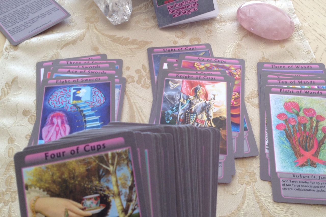 The full deck name, Tarot Pink for Cancer, would not have been my first choice. “Tarot Pink for Cancer” sounds like we support cancer, rather than support a cure for cancer, or funding research for cancer, etc. I don’t know, maybe it’s just me, but it doesn’t sound auspicious and superstitious me would have gone for a more auspicious name, one that unambiguously supports a cure, and healing. So henceforth I will be calling the deck Tarot Pink only, leaving off the “for Cancer” part.