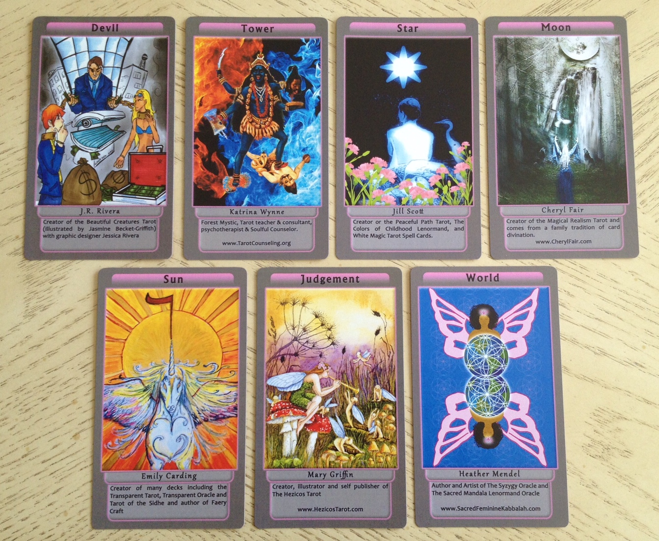 In terms of the deck being “collaborative,” it was a collaborative deck in the sense that many artists contributed their work. However, I must confess that in the production and planning process, I did feel–and perhaps I am wrong and it was all in my head with no bearing on what actually went down–that agreeable opinions were held up and dissenting opinions were dismissed. I watched it happen to me and I watched it happen to a few others. Honestly, I didn’t feel like my opinions were valued–unless I was agreeing with the majority, and then it was certainly valued– and so toward the end, I simply stopped offering any dissenting opinions.