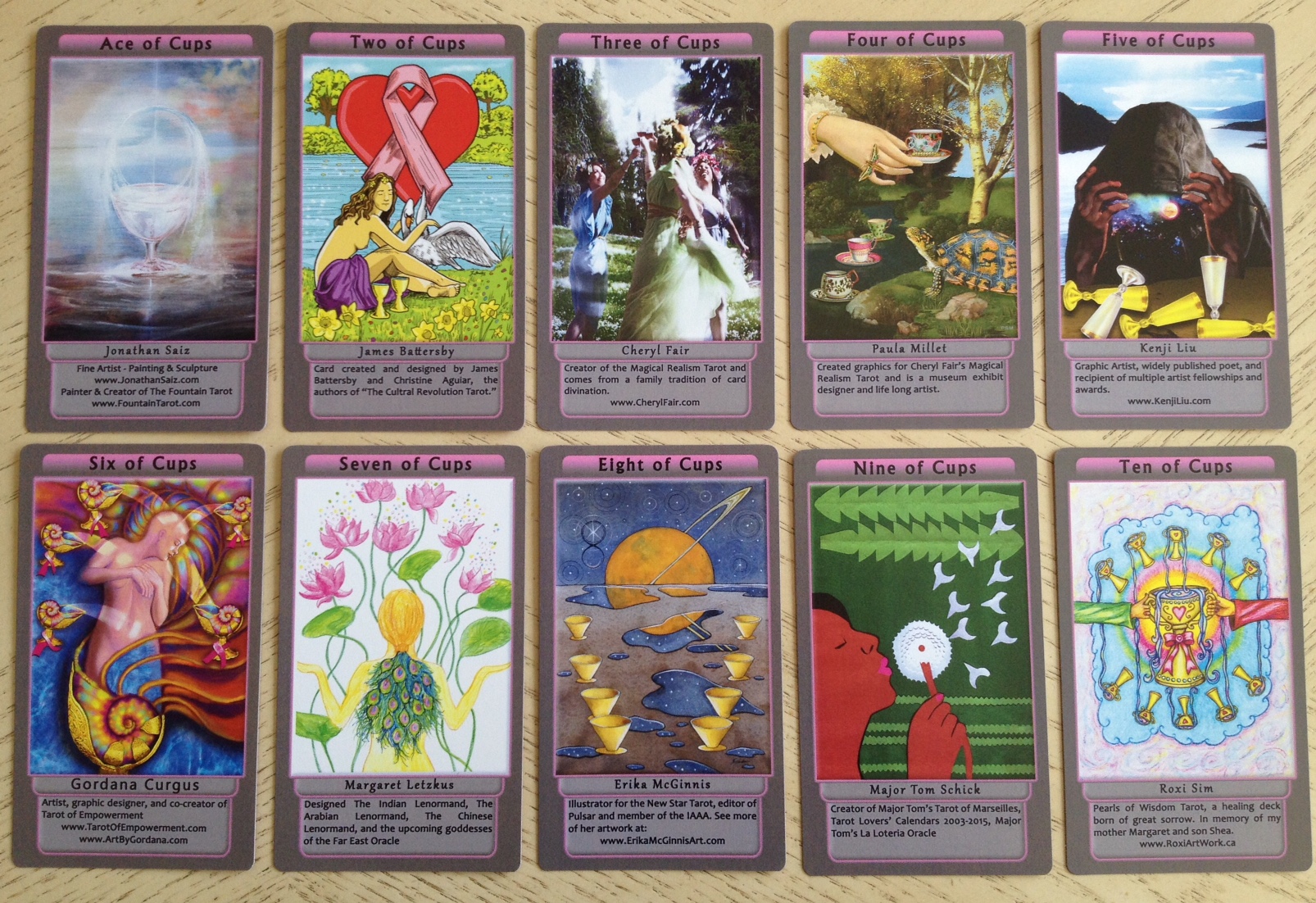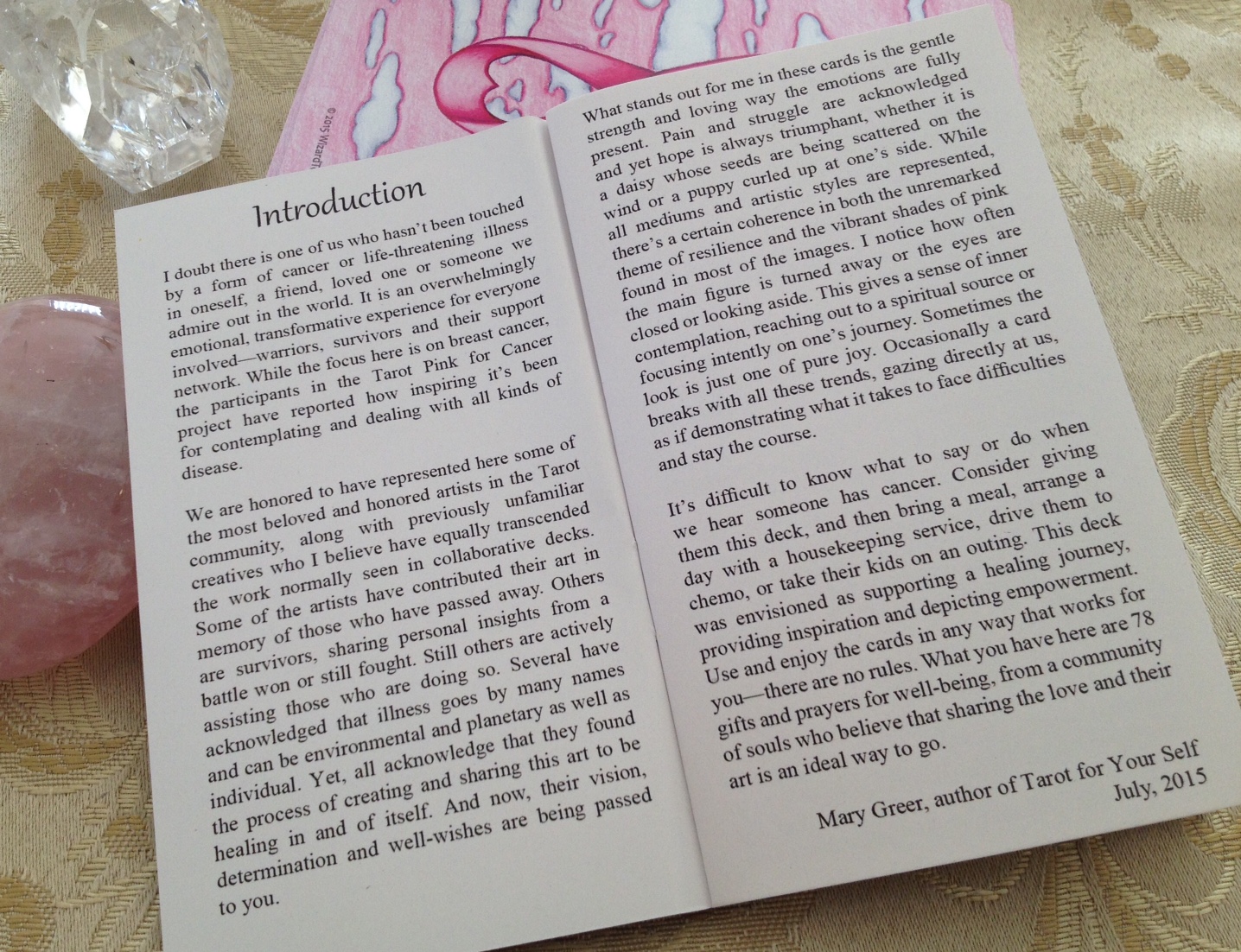 In the end, the devotion, healing magic, and compassion of the 65 artists trump all. Rest assured that the organizers’ efforts are entirely sincere. The charitable cause hit way too close to home for many of us contributors and so the passion for contributing to the funding of cancer research is heartfelt. Any collaborative art project involving more than one artist (even when it involves only one artist…) is like herding cats and frankly, the chaos that resulted was caused by various artsy kitties wandering off the range. But everyone came together in the end, despite differing opinions, to love and support one another. That, I’m sure, only adds to all that devotion, healing magic, and compassion of Tarot Pink. Check out Mary Greer’s moving Introduction in the LWB. It sums up why this deck has been brought into existence. It sums up why Tarot Pink matters.