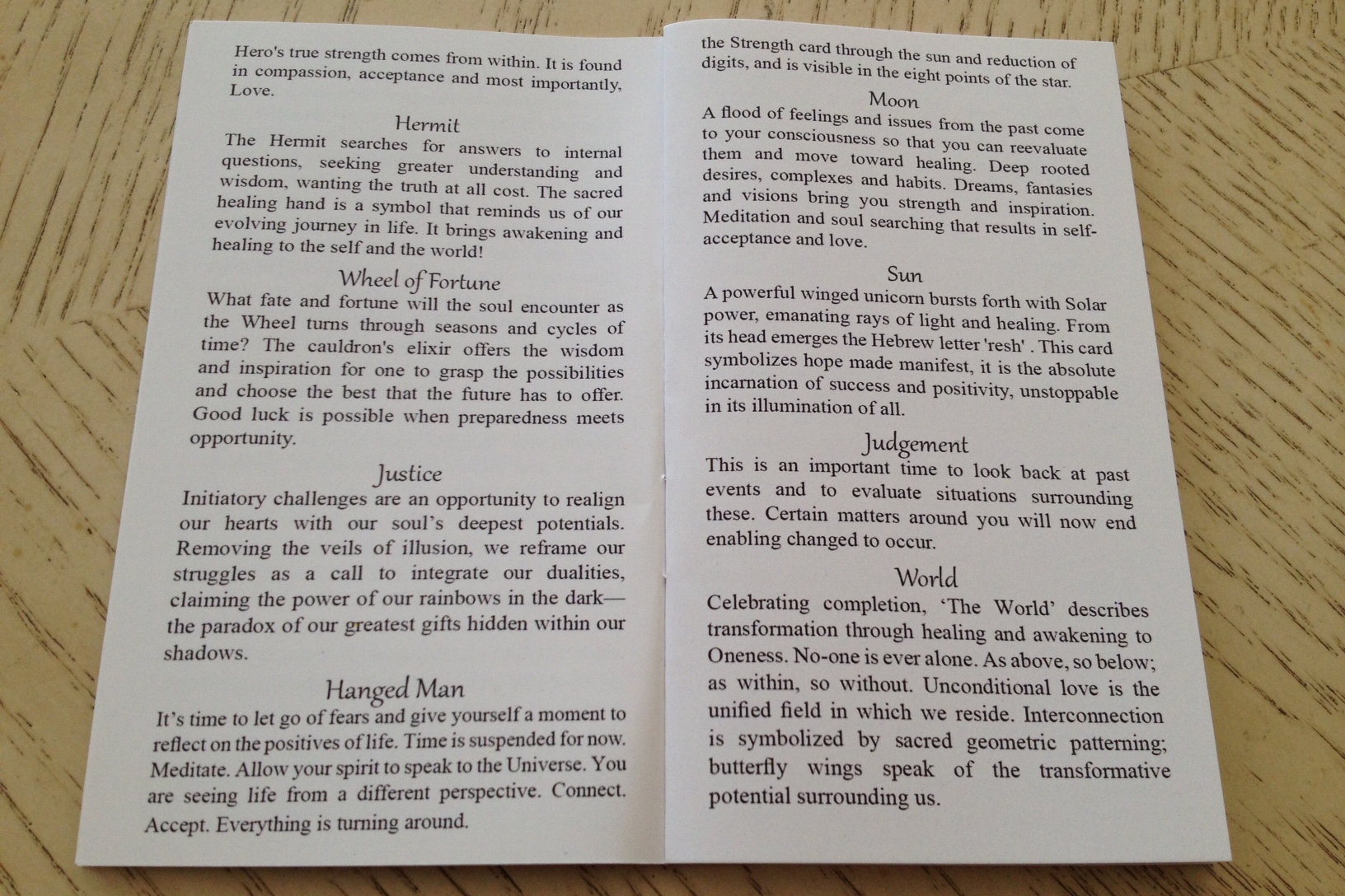 I couldn’t agree more! Everything you say is spot on. I was so disappointed with the text box blurb on the front of the cards that I’m considering cutting it off. This info should have been included in the LWB. Instead of a healing tool, this deck just looks like a tacky marketing tool for the contributors (which I’m sure was not the intention) however, Mary K Greer goes some way to make it all better when she said ‘this is a deck of 78 prayers. All of the images that have been created are simply gorgeous and you can really feel the healing energy exuding from them – it’s just such a terrible shame that they’ve been relegated to second place.