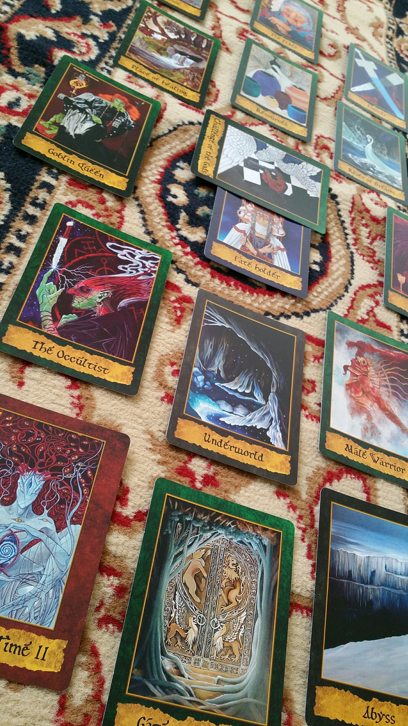 For the other three realms, the Divine Realm (red borders), Inner Realm (dark blue borders) and Realm of Death and the Underworld (black borders), I set out the cards in the order that they appear in the companion guidebook. Here for the Physical World (green borders), I’m setting the cards out in alphabetical order.