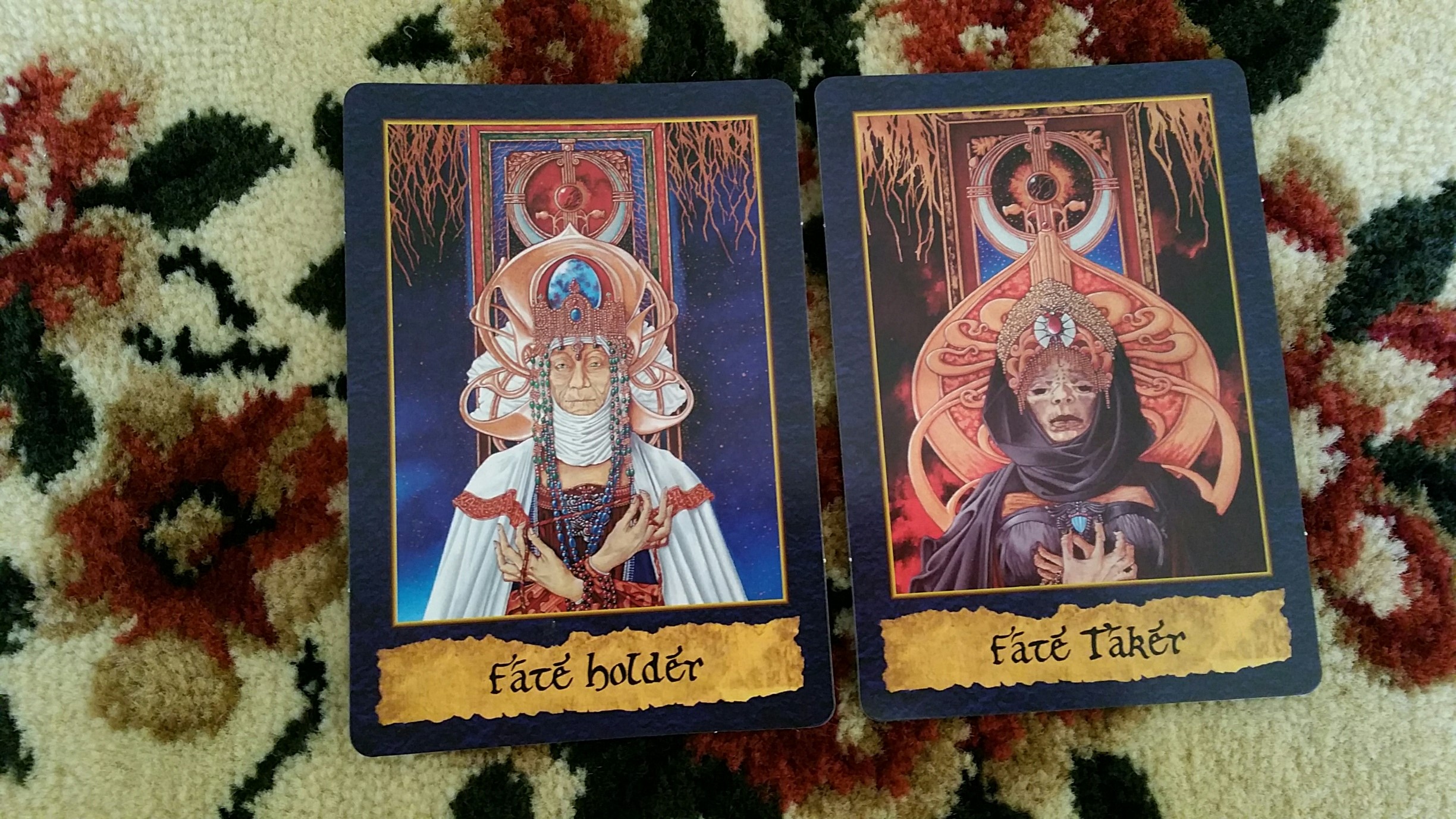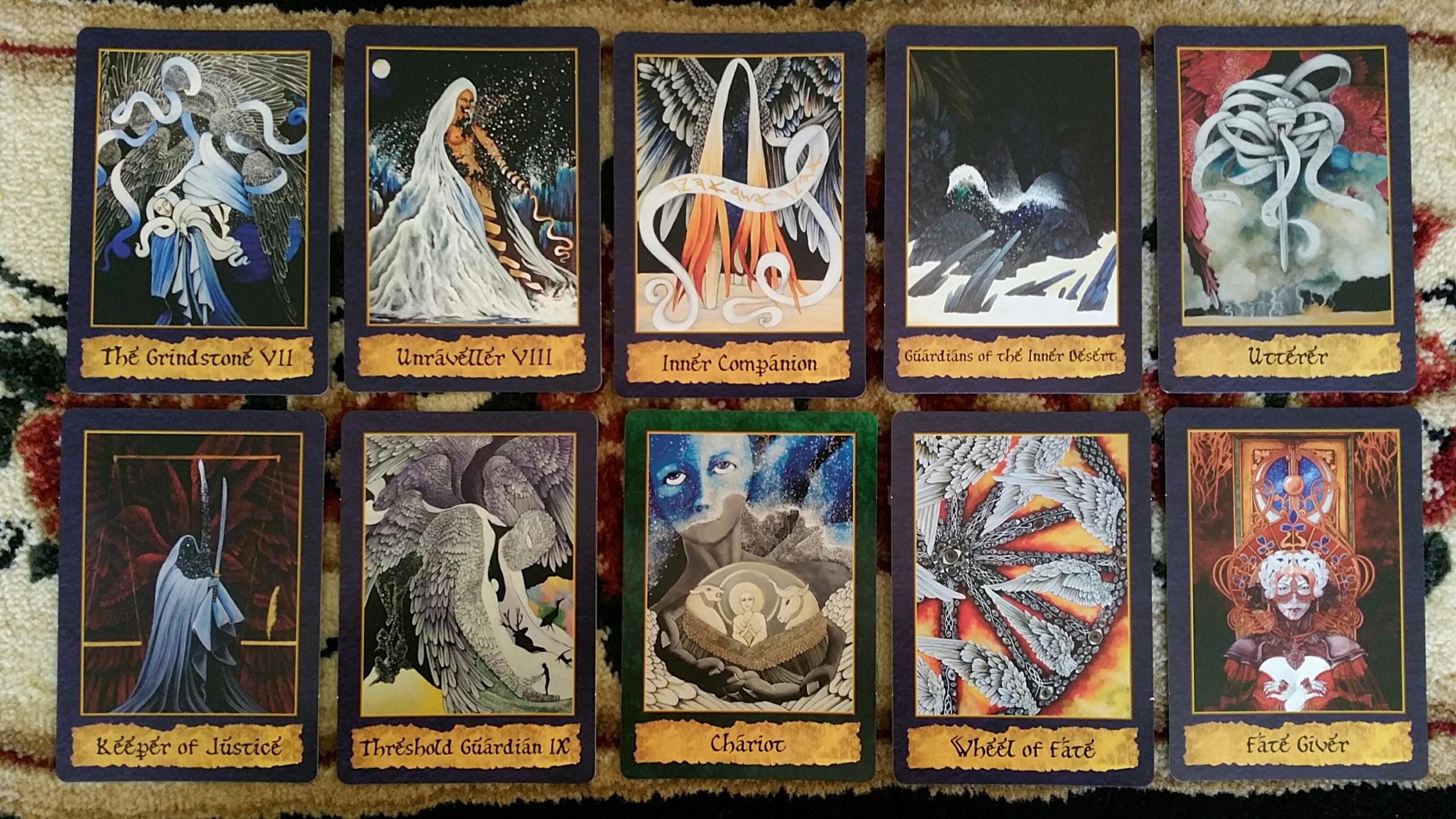 I was snapping photos of the card images 10 at a time, but what I should have done was kept the three fate goddesses together– the Fate Giver, seen at the end of the previous photo, and the two above, the Fate Holder and the Fate Taker. The Fate Giver is about setting new lines into motion; the Fate Holder is about marking boundaries, restrictions, and ensuring impermanence; the Fate Taker who dissolves ending lines. The companion guidebook offers several paragraphs of description for each card and is a great starting point for understanding these contacts.