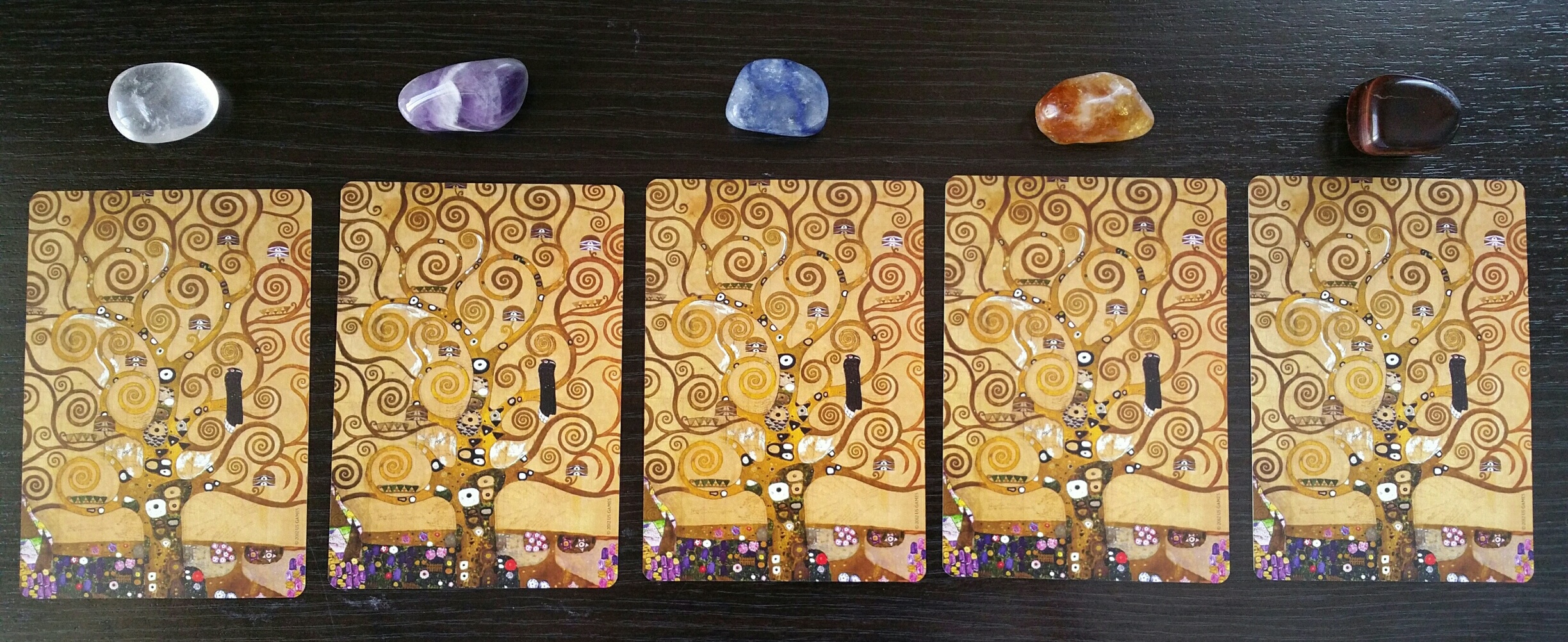 Above, we have five cards under five stones. Right to left, we first see red tiger eye. Choose the card below the red tiger eye for insight into work/career matters. If you want to know about your personal finances and money matters, choose the card below the citrine quartz. If you want to know about a creative project you’re working on, choose the card below the dumortierite. If you want a message on your current spiritual path, choose the card below the amethyst. For a wild card, for whatever message Spirit will impart onto you, choose the card below the crystal quartz.