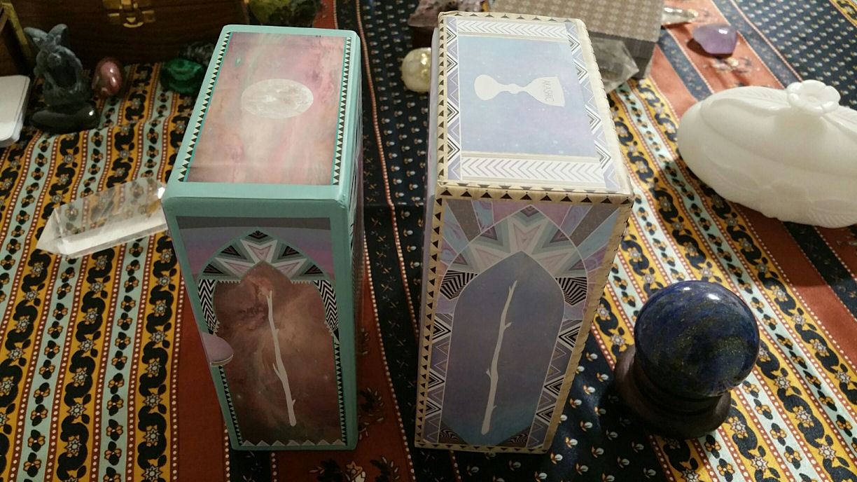 Here I’m just comparing the packaging of the two decks, side by side. Again you can see the creative decision to emphasize a more pastel palette.
