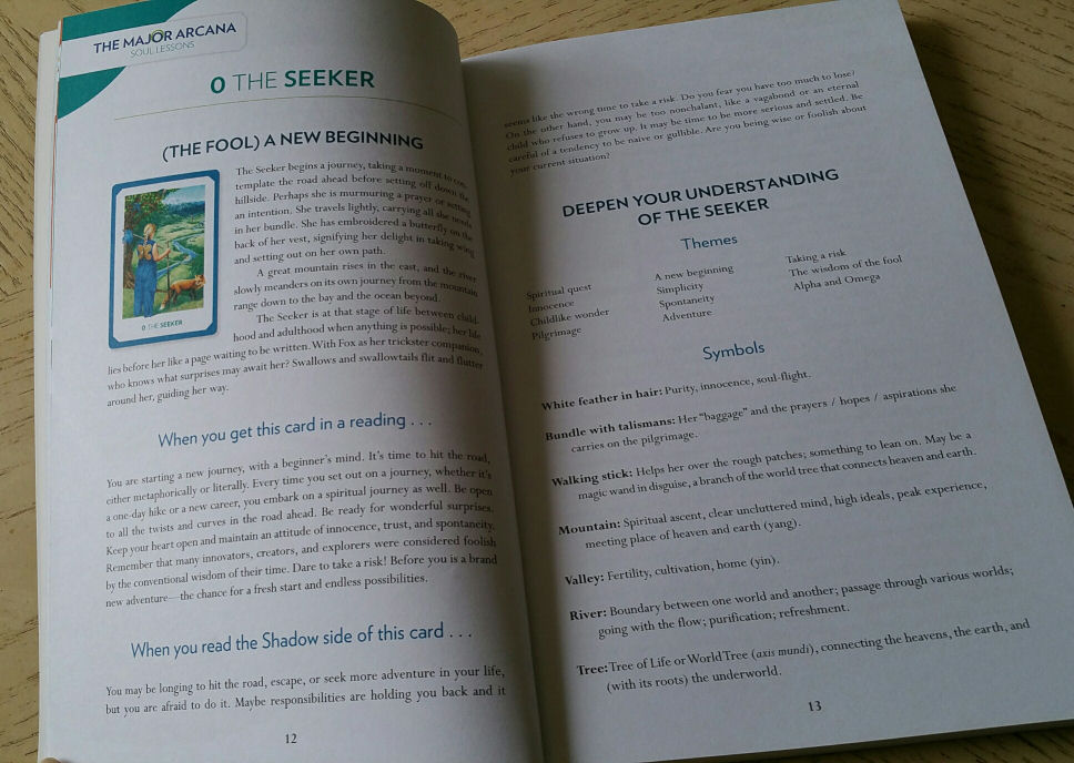 The above and below photographs give you sampling of the guidebook’s content. Here, you see the entry for Key 0 (traditionally “The Fool”), which is The Seeker in the Gaian Tarot. I love that this card is called The Seeker. There’s a three-page spread for the card. Every Major Arcanum is given three to four pages in this guidebook, so the text is dense with information.
