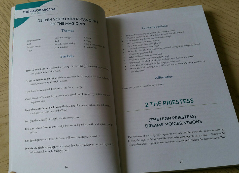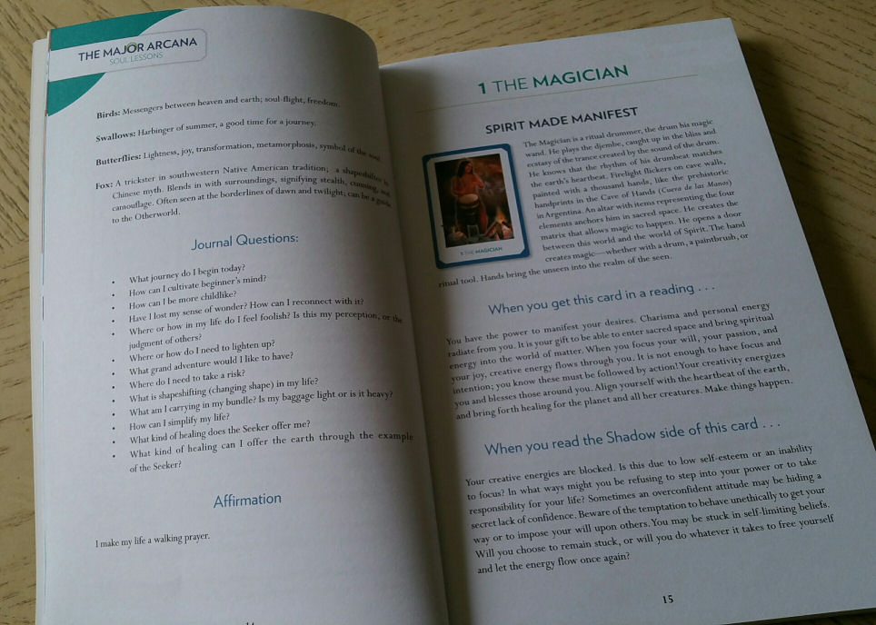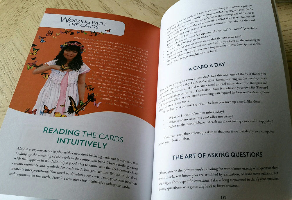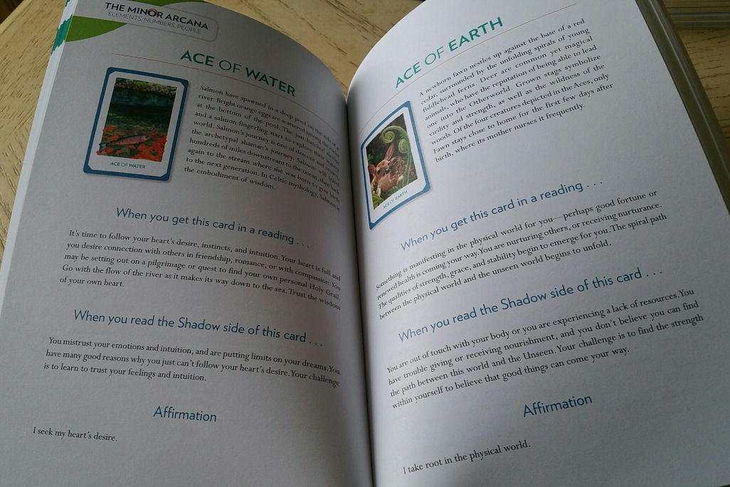 The guidebook itself is in full color with beautiful layout design and easy-to-follow organization. I love the affirmations. You can do a daily card draw in the mornings, and then find the corresponding entry of that card in the guidebook to read the affirmation. Then adopt that affirmation as your mantra for the day.