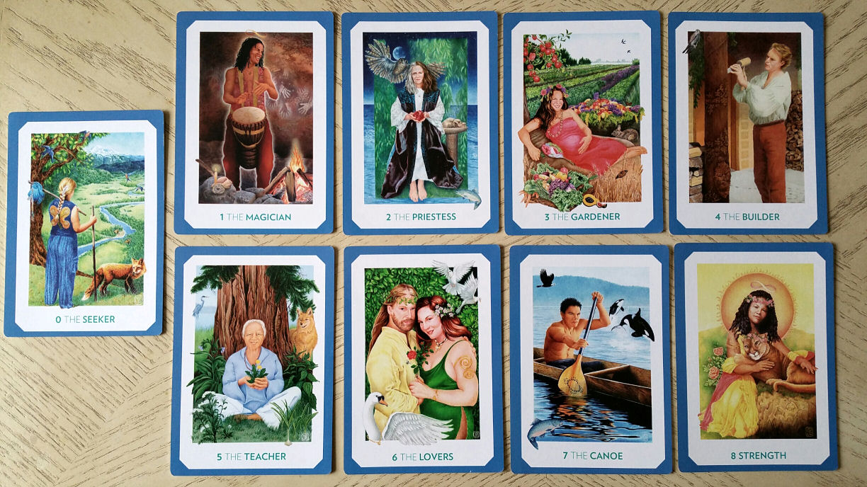 Here is where I say you have to read the companion book. I confess I often skip the companion book and find that I don’t miss out on much by skipping it. For Colbert’s deck, you are going to miss out on so much if you skip this guidebook. She’s written one of the best companion books to a deck I’ve come across. Like the symbolism for the white feather in the seeker’s hair, how there are talismans in her knapsack bundle, her walking stick, and so much more. The red and white flowers on the vest The Magician is wearing– the willow in the Priestess card– the Willendorf figurine in The Gardener (Key 3: The Empress), or the narrative being told in the rock carvings in the Strength card (Key 8).