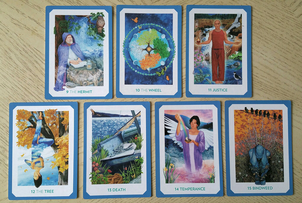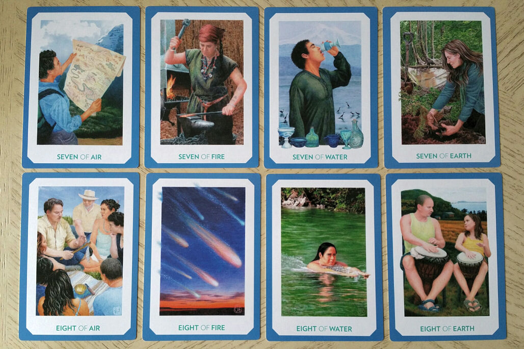 The Gaian Tarot offers new perspectives on the tarot cards. The Seven of Air, for instance, corresponding with the Seven of Swords (in the Rider-Waite-Smith, it’s the one of the figure in a red hat, red boots, absconding away from a tent set-up holding a bundle of swords), here we see a hiker taking a pause to look at his map and figure out which direction he’s going in. The affirmation for the Seven of Air is “I make my plans, but leave room for serendipity.” It works seamlessly with how most might interpret the Seven of Swords but polishes that interpretation for a spirituality-guided reading.