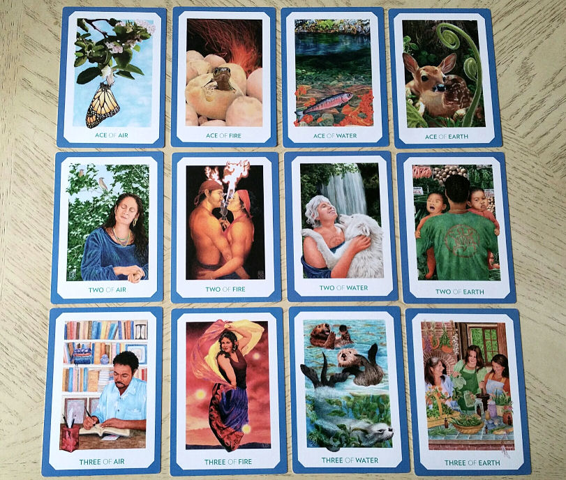 The meanings ascribed to each card in the Gaian Tarot and the symbolism used to evoke those meanings are decidedly grounded in earth-based spiritualism, such as the song, prayer, and drumming in the Six of Air, or the sacred circle depicted in the Four of Fire, or the skyclad mermaid sisters in the Six of Water. Spiritually significant landmarks, such as the Chalice Well in Glastonbury, are also depicted, noting the Four of Water.