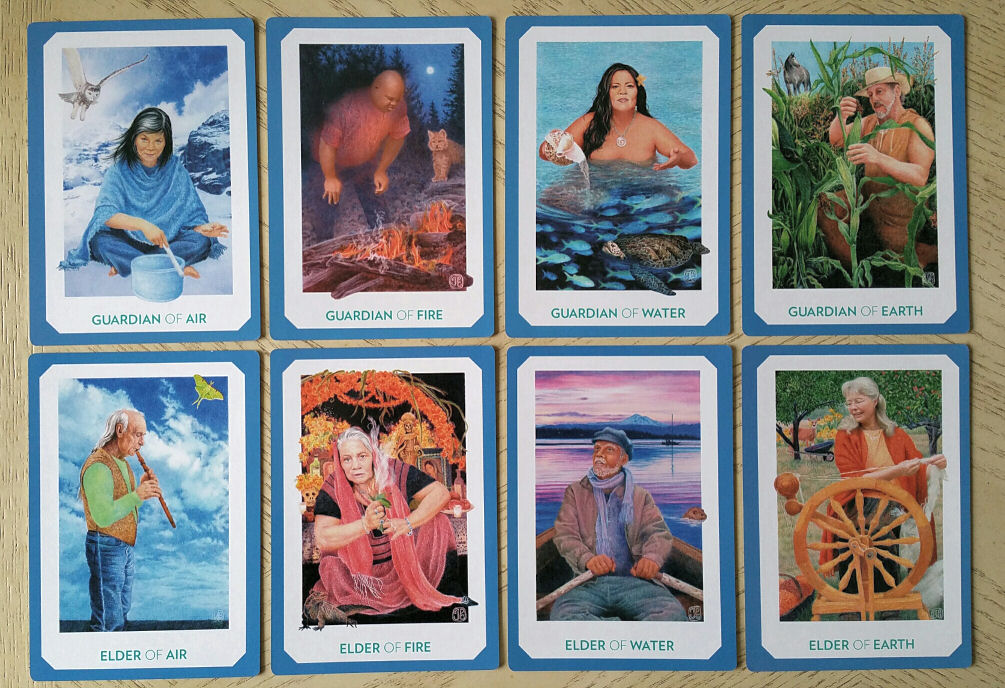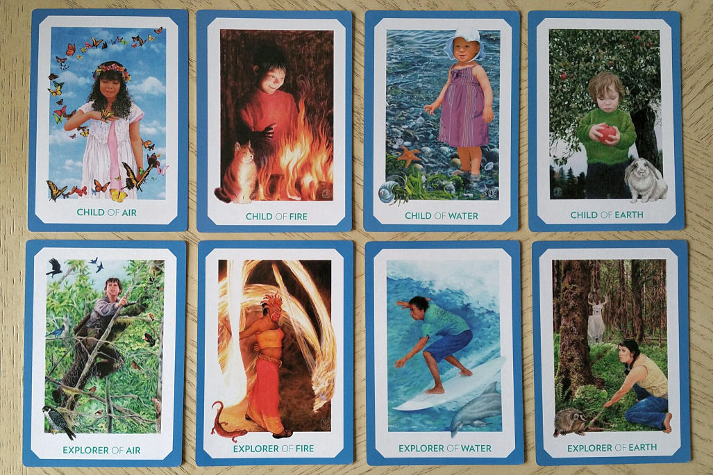 I love what Colbert has done with the court cards here. The traditional Pages, Knights, Queens, and Kings have been reiterated as Children, Explorers, Guardians, and Elders. Children indicate the personality of discovery. Explorers indicate the growth principle and often, growing pains. The Guardians are about nurturing to fruition. Elders are wise leaders and authority figures, respected in the community.