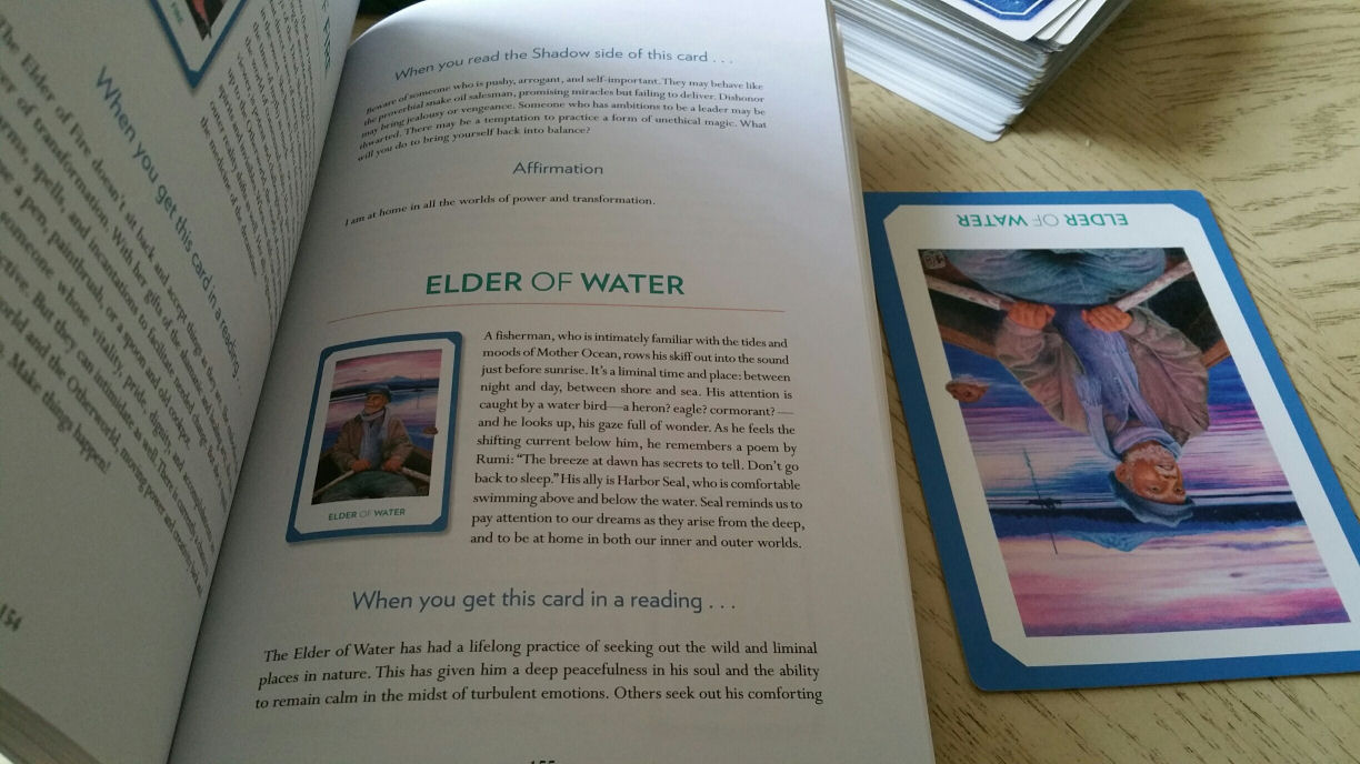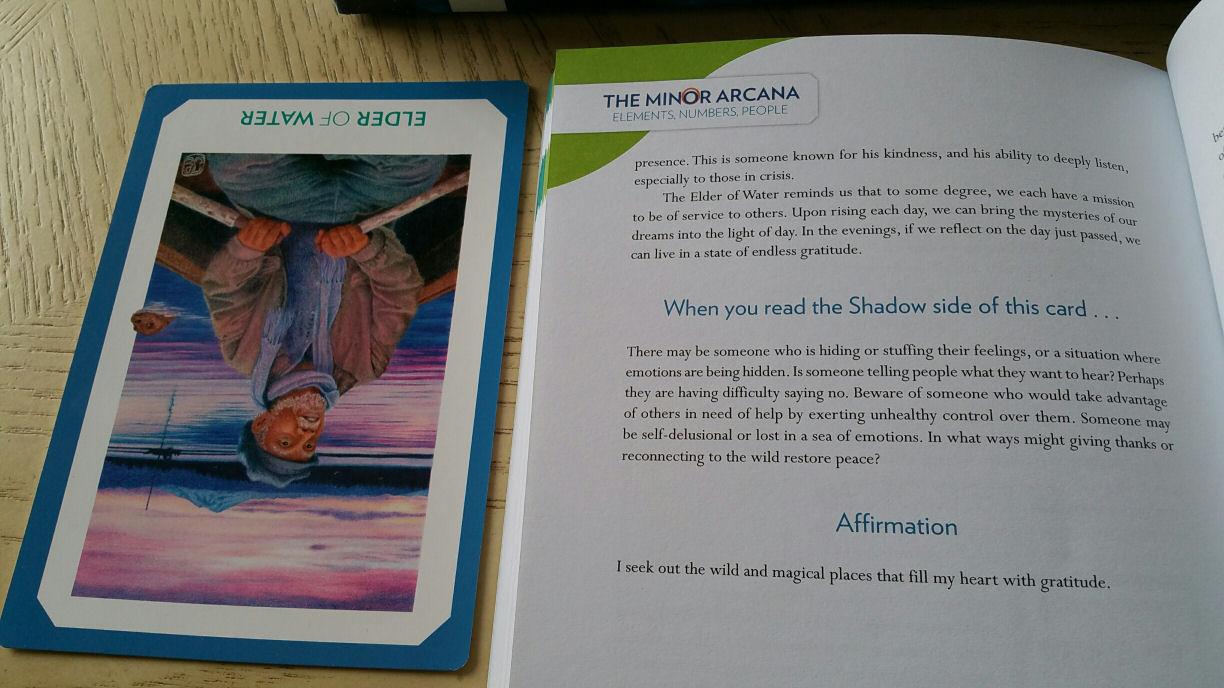 Given the dedicates passages in the guidebook on the Shadow side of each card, I’ve shuffled the deck in a way to observe card reversals. Here, for Spirit, we get the Elder of Water in reverse. The accompanying entry for the Shadow side of this Elder is in the image below. In your spiritual journeying and where your Spirit is at this moment is in a period of restoration, and to explore restorative energy for yourself.