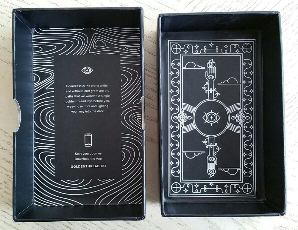 The interior line drawing is just as beautiful, with minimalist references to the “golden thread.” I actually wish the card back design for the deck was the art featured in the top right half of the box, which would make it reversible.