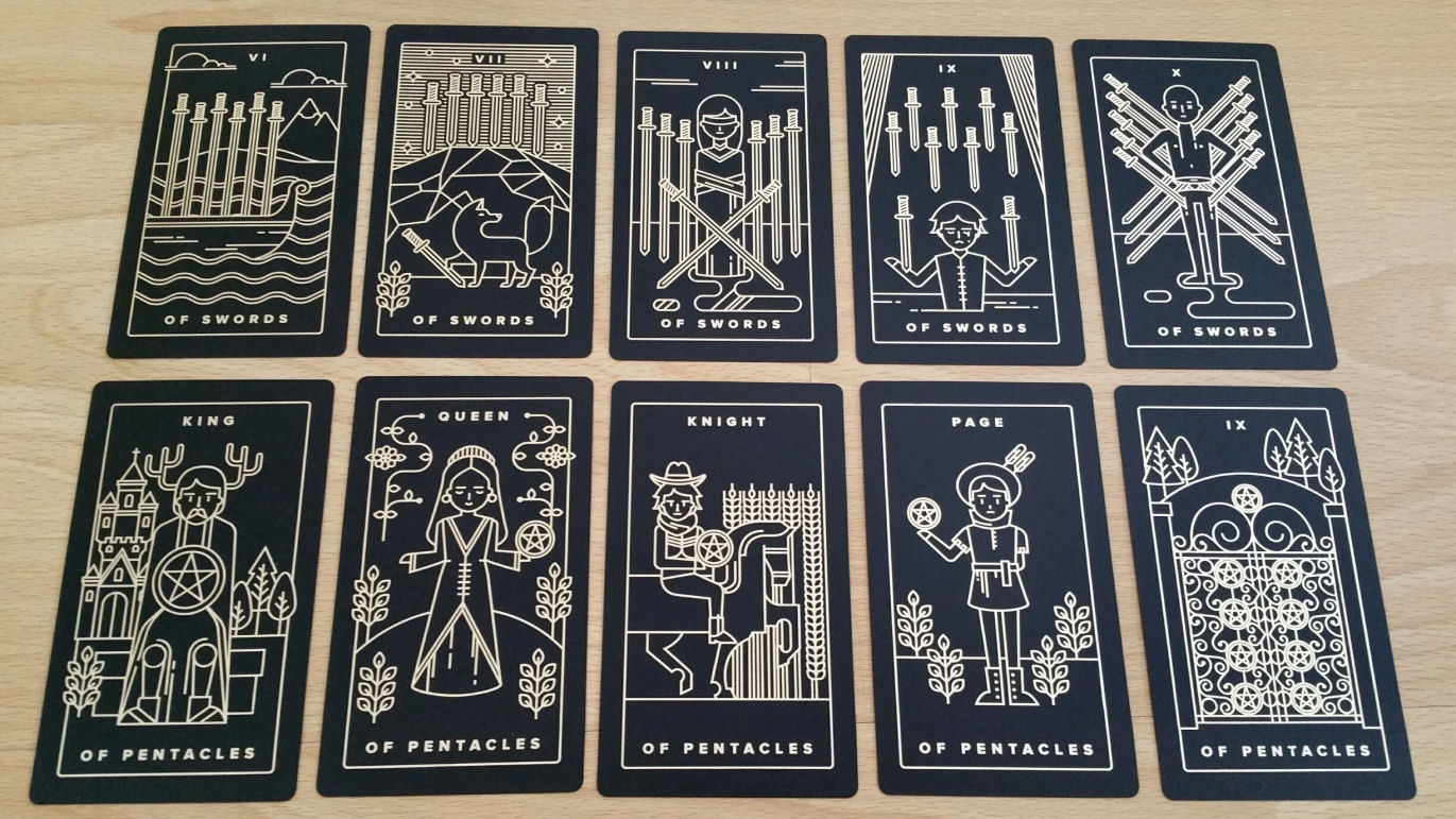 Many of the illustrations stay true to the iconic symbolism in the RWS, such as the Two of Swords and Three of Swords, pictured above. Speaking of spreads, I adore how the cards look when you set them out on a table. They are just stunning to look at. They capture the mood and spirit of divination with a perspicacity that few modern tarot decks achieve.