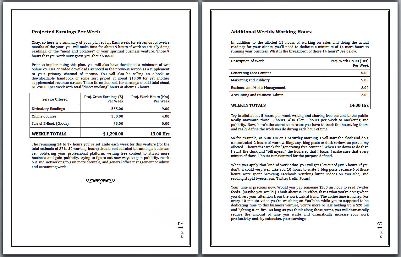Whether you decide to go crazy and tack on 27 hours of extra work to your current working schedule to launch a spiritual service venture part-time (technically, a 27-hour work week counts as “part time”) or you’re aspiring to go full-time as a professional reader offering spiritual services and want some tips, I’ve put together a little handbook that instructs on a formula I came up with for achieving the targets I listed: $50K in earnings from a spiritual business service by putting in a 27 hour work week.