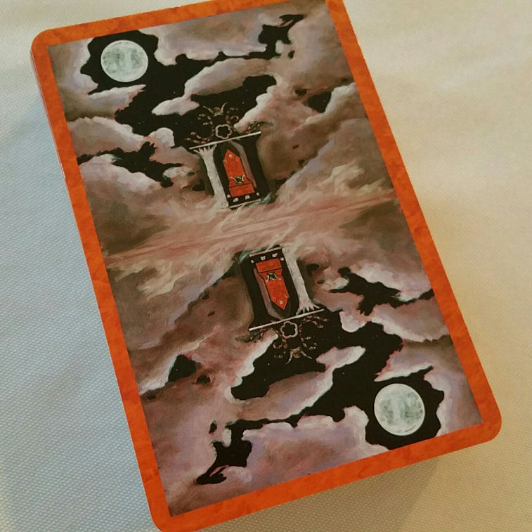 The card backs are reversible, again with the orange border, and here we see just this incredible glimpse into a different dimension or galaxy, slightly reminiscent of the dark and light pillars you find in the classic High Priestess card.