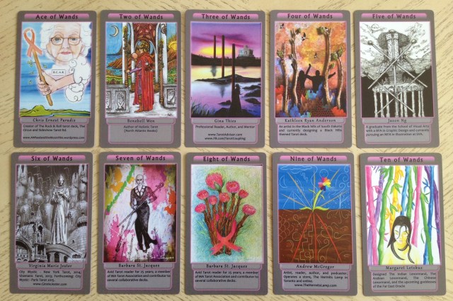I created a tarot card for a collaborative tarot project a while back, the Tarot Pink, a charity project that donated all sales proceeds to support breast cancer awareness. My card was the Two of Wands. You can spot my contribution in the top row above, second card from the left.
