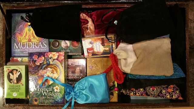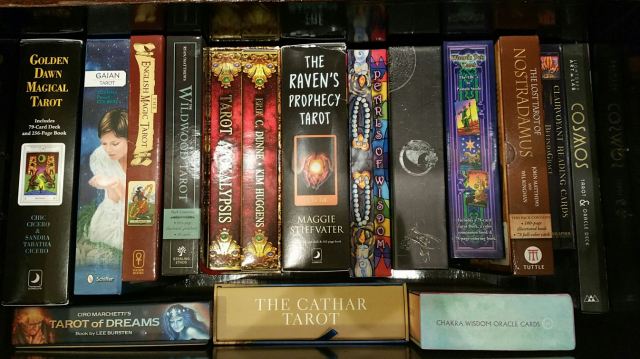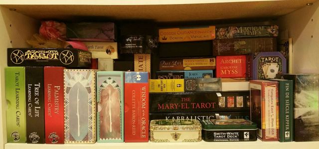 I have no idea. A couple years ago I was telling everybody 100. Then last year I sat down and actually counted them all to log into an inventory and it was closer to 300. I was off by, um… 200 decks. My collection is diverse and I have a little bit of everything, from dark to fluff, esoteric tarot to Hello Kitty and love-and-light.