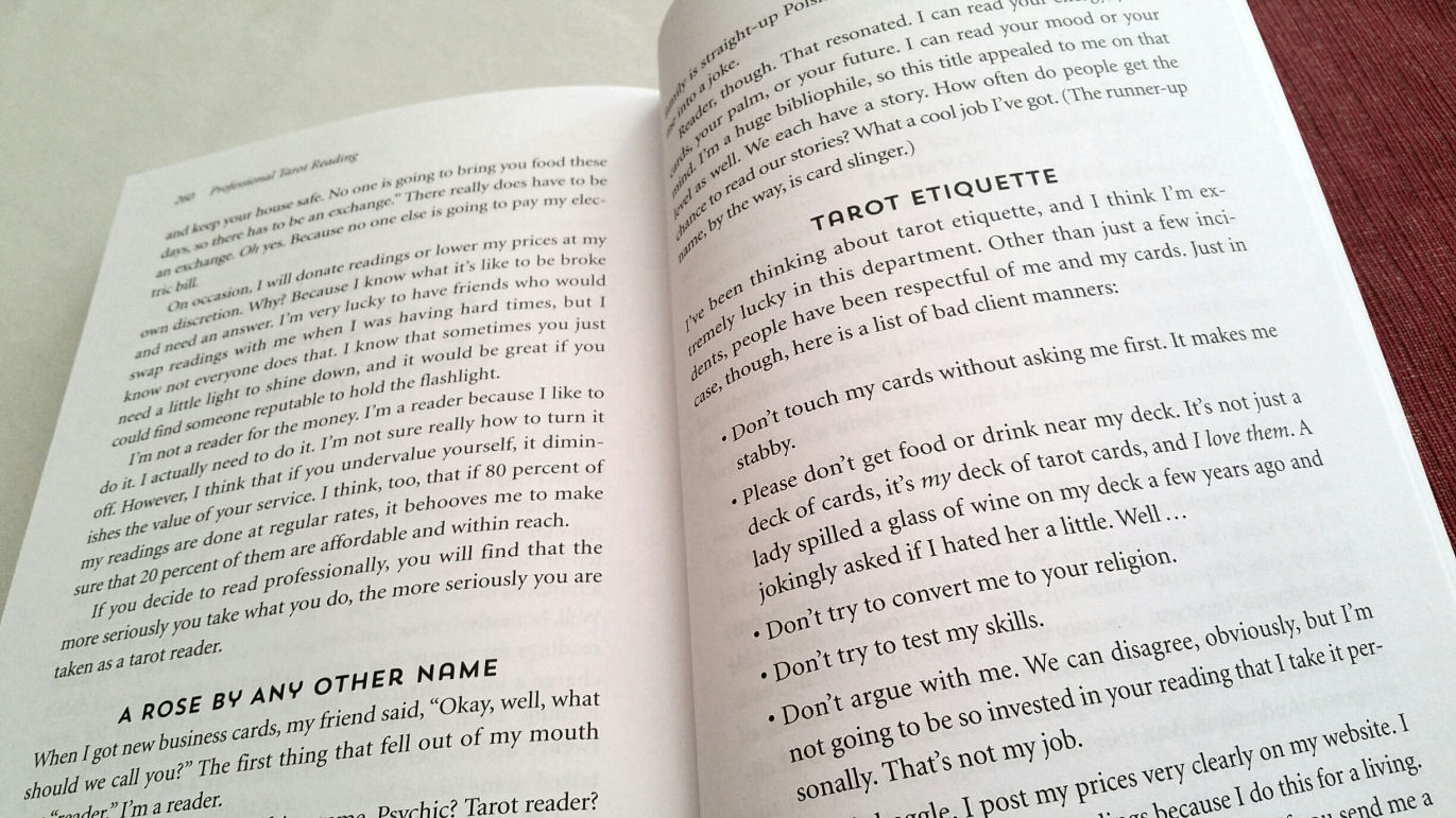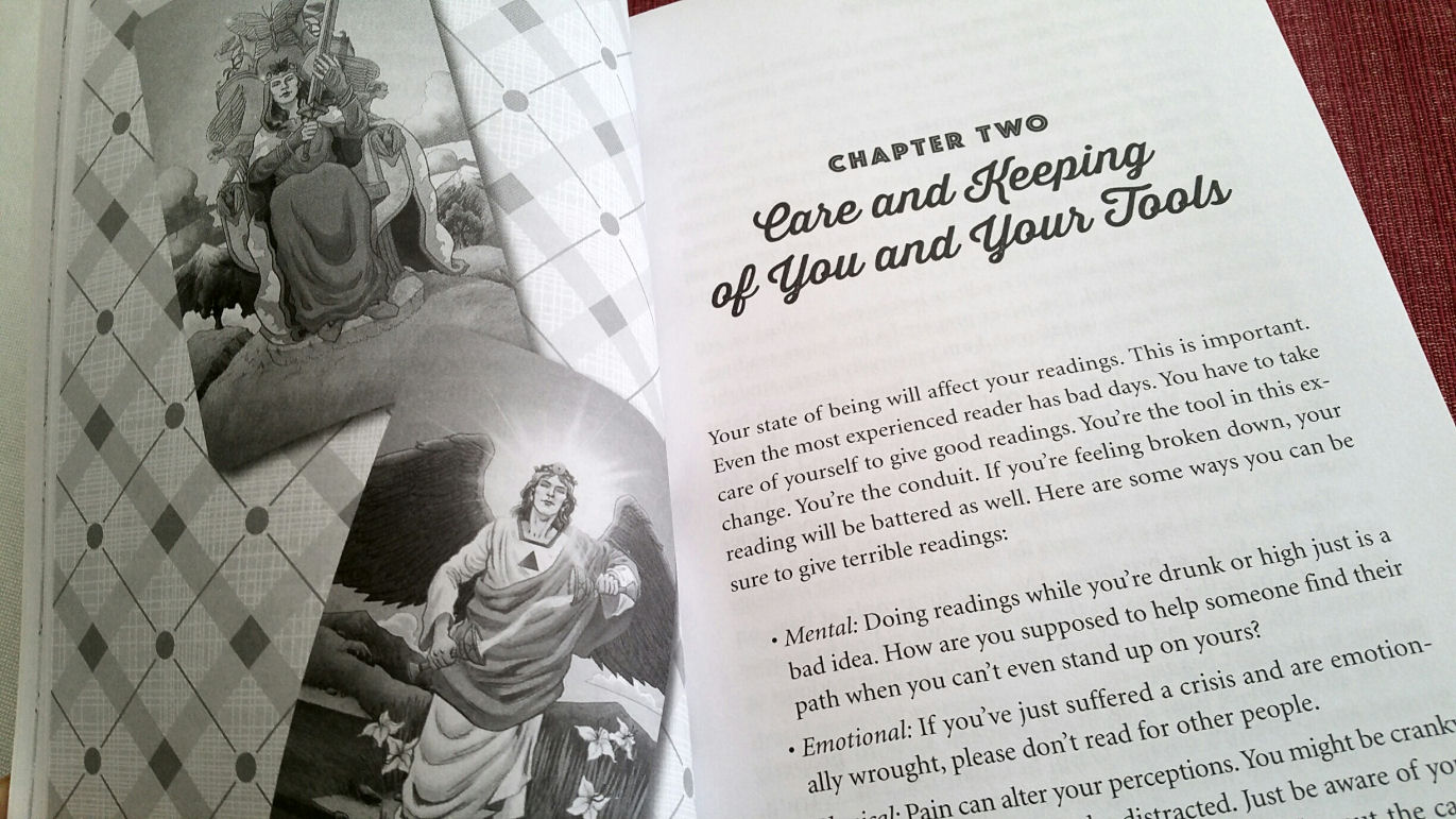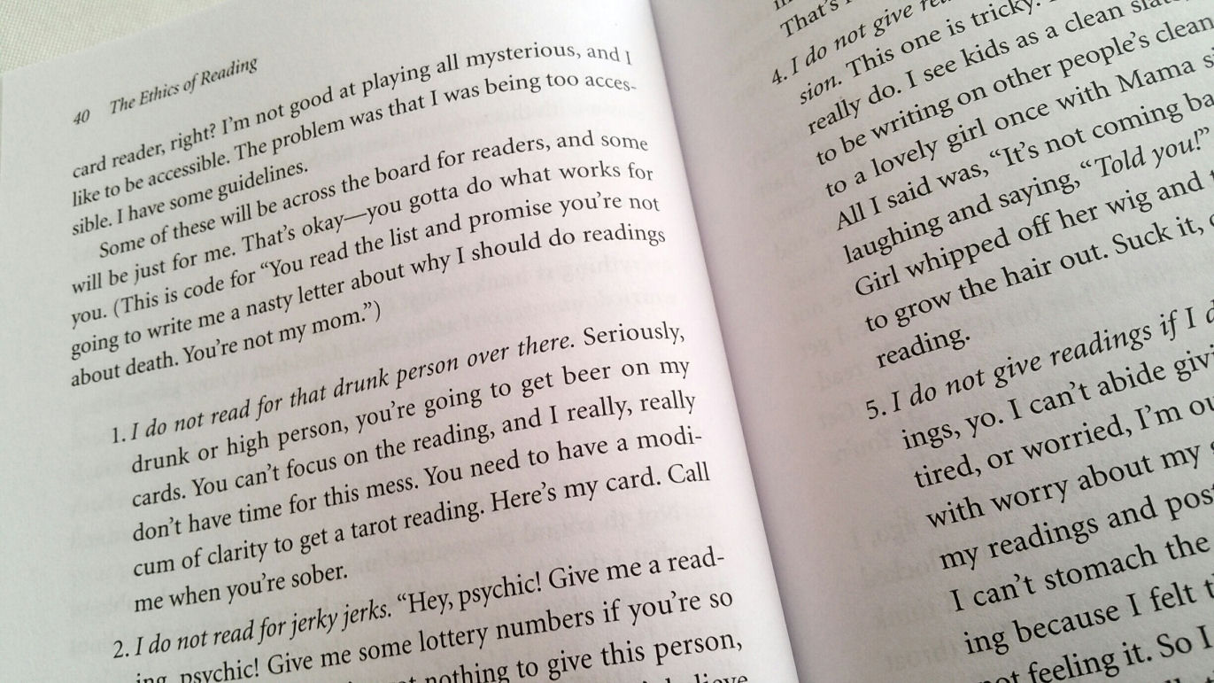 Under “The Ethics of Reading,” I appreciate how number 1 on the list is the recommendation to not read for drunk people. I learned that the hard way. A noticeably drunk man once sat down for a reading when I was reading at a cocktail reception and right away I got nervous, watching the wine in his glass swish around the rim. However, I kept my nervousness to myself, forced a smile, started shuffling, and proceeded with the reading. Less than five minutes into the reading, his own hand knocked over his wine glass and red wine spilled all over one of my favorite go-to tarot decks. And he was way too drunk to even be apologetic! So, tarot readers, listen up. Heed Melissa’s advice!
