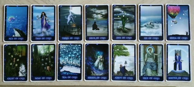 I do like the deck overall–some beautiful images, and I like the altered Majors. I did notice that the creator changed the suit of Swords to “Orbs”, however, both the King and Queen (Master and Sage) of Orbs are holding swords, not orbs. Very inconsistent, and I think they should re-design them.
